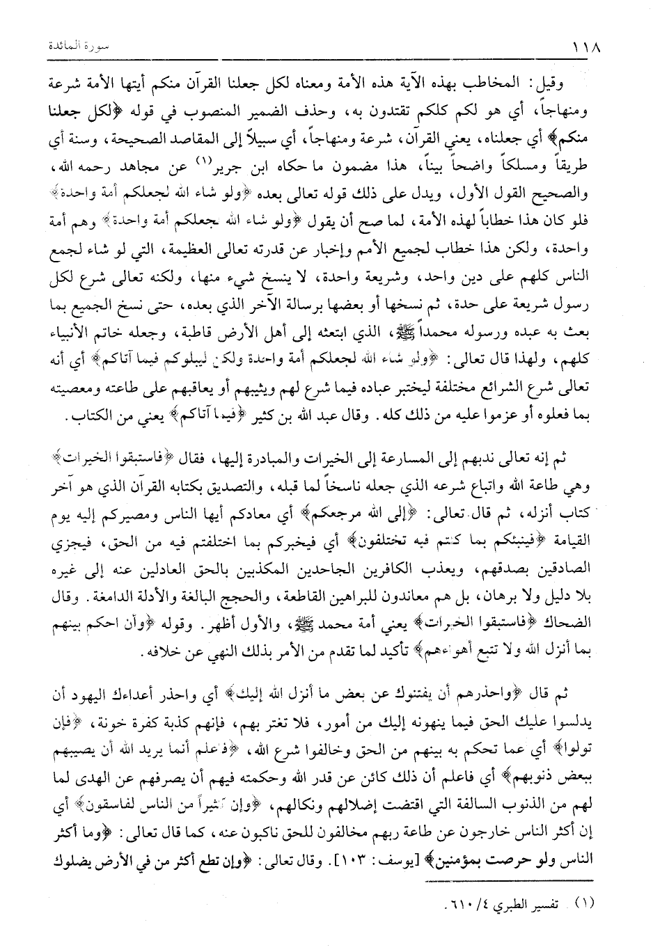 وقيل: المخاطب بهذه الآية هَذِهِ الْأُمَّةُ وَمَعْنَاهُ لِكُلٍّ جَعَلْنَا الْقُرْآنَ مِنْكُمْ أَيَّتُهَا الْأُمَّةُ شِرْعَةً وَمِنْهَاجًا، أَيْ هُوَ لَكُمْ كُلِّكُمْ تَقْتَدُونَ بِهِ، وَحُذِفَ الضَّمِيرُ الْمَنْصُوبُ فِي قَوْلِهِ لِكُلٍّ جَعَلْنا مِنْكُمْ أَيْ جَعَلْنَاهُ، يَعْنِي الْقُرْآنَ، شِرْعَةً وَمِنْهَاجًا، أَيْ سَبِيلًا إِلَى الْمَقَاصِدِ الصَّحِيحَةِ، وَسُنَّةً أَيْ طَرِيقًا وَمَسْلَكًا وَاضِحًا بَيِّنًا، هَذَا مَضْمُونُ مَا حَكَاهُ ابْنُ جَرِيرٍ «1» عَنْ مُجَاهِدٍ رَحِمَهُ اللَّهُ، وَالصَّحِيحُ الْقَوْلُ الْأَوَّلُ، وَيَدُلُّ على ذلك قوله تعالى بعده وَلَوْ شاءَ اللَّهُ لَجَعَلَكُمْ أُمَّةً واحِدَةً فَلَوْ كَانَ هَذَا خِطَابًا لِهَذِهِ الْأُمَّةِ، لَمَا صَحَّ أَنْ يَقُولَ وَلَوْ شاءَ اللَّهُ لَجَعَلَكُمْ أُمَّةً واحِدَةً وَهْمُ أُمَّةٌ وَاحِدَةٌ، وَلَكِنَّ هَذَا خِطَابٌ لِجَمِيعِ الْأُمَمِ وَإِخْبَارٌ عَنْ قُدْرَتِهِ تَعَالَى الْعَظِيمَةِ، الَّتِي لَوْ شَاءَ لَجَمَعَ النَّاسَ كُلَّهُمْ عَلَى دِينٍ وَاحِدٍ، وَشَرِيعَةٍ وَاحِدَةٍ، لَا يُنْسَخُ شَيْءٌ منها، ولكنه تعالى شرع لكل رسول شريعة عَلَى حِدَةٍ، ثُمَّ نَسَخَهَا أَوْ بَعْضَهَا بِرِسَالَةِ الْآخَرِ الَّذِي بَعْدَهُ، حَتَّى نَسَخَ الْجَمِيعَ بِمَا بَعَثَ بِهِ عَبْدَهُ وَرَسُولَهُ مُحَمَّدًا صَلَّى اللَّهُ عَلَيْهِ وَسَلَّمَ، الَّذِي ابْتَعَثَهُ إِلَى أَهْلِ الْأَرْضِ قَاطِبَةً، وَجَعَلَهُ خَاتَمَ الْأَنْبِيَاءِ كُلِّهِمْ، وَلِهَذَا قَالَ تَعَالَى: وَلَوْ شاءَ اللَّهُ لَجَعَلَكُمْ أُمَّةً واحِدَةً وَلكِنْ لِيَبْلُوَكُمْ فِي مَا آتاكُمْ أَيْ أَنَّهُ تَعَالَى شَرَعَ الشَّرَائِعَ مُخْتَلِفَةً لِيَخْتَبِرَ عِبَادَهُ فِيمَا شَرَعَ لَهُمْ وَيُثِيبَهُمْ أَوْ يُعَاقِبَهُمْ عَلَى طَاعَتِهِ وَمَعْصِيَتِهِ بِمَا فَعَلُوهُ أَوْ عَزَمُوا عَلَيْهِ مِنْ ذَلِكَ كُلِّهِ. وَقَالَ عَبْدُ اللَّهِ بْنُ كَثِيرٍ فِي مَا آتاكُمْ