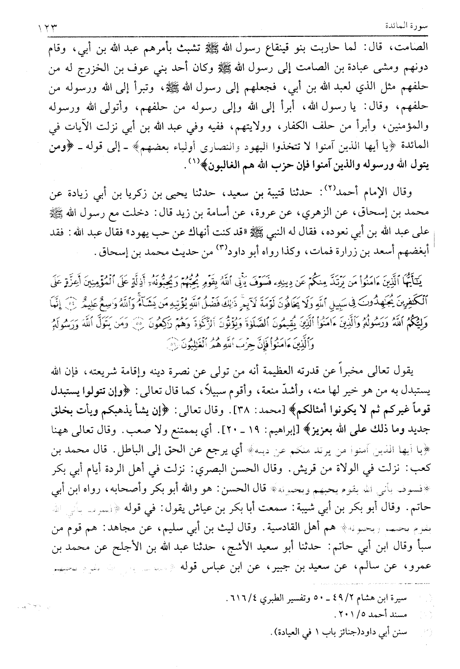 الصَّامِتِ، قَالَ: لَمَّا حَارَبَتْ بَنُو قَيْنُقَاعَ رَسُولَ اللَّهِ صَلَّى اللَّهُ عَلَيْهِ وَسَلَّمَ تَشَبَّثَ بِأَمْرِهِمْ عَبْدُ اللَّهِ بْنُ أُبَيٍّ، وَقَامَ دُونَهُمْ وَمَشَى عُبَادَةُ بْنُ الصَّامِتِ إِلَى رَسُولِ اللَّهِ صَلَّى اللَّهُ عَلَيْهِ وَسَلَّمَ وَكَانَ أَحَدَ بَنِي عَوْفِ بْنِ الْخَزْرَجِ لَهُ مِنْ حِلْفِهِمْ مِثْلَ الَّذِي لِعَبْدِ اللَّهِ بْنِ أُبَيٍّ، فَجَعَلَهُمْ إِلَى رَسُولِ اللَّهِ صَلَّى اللَّهُ عَلَيْهِ وَسَلَّمَ، وَتَبَرَّأَ إِلَى الله ورسوله من حلفهم، وقال: يا رسول الله، أبرأ إِلَى اللَّهِ وَإِلَى رَسُولِهِ مِنْ حِلْفِهِمْ، وَأَتَوَلَّى اللَّهَ وَرَسُولَهُ وَالْمُؤْمِنِينَ، وَأَبْرَأُ مِنْ حِلْفَ الْكُفَّارِ، وَوَلَايَتِهِمْ، فَفِيهِ وَفِي عَبْدِ اللَّهِ بْنِ أُبَيٍّ نَزَلَتِ الْآيَاتُ فِي الْمَائِدَةِ يَا أَيُّهَا الَّذِينَ آمَنُوا لَا تَتَّخِذُوا الْيَهُودَ وَالنَّصارى أَوْلِياءَ بَعْضُهُمْ- إِلَى قَوْلِهِ- وَمَنْ يَتَوَلَّ اللَّهَ وَرَسُولَهُ وَالَّذِينَ آمَنُوا فَإِنَّ حِزْبَ اللَّهِ هُمُ الْغالِبُونَ «1» .
