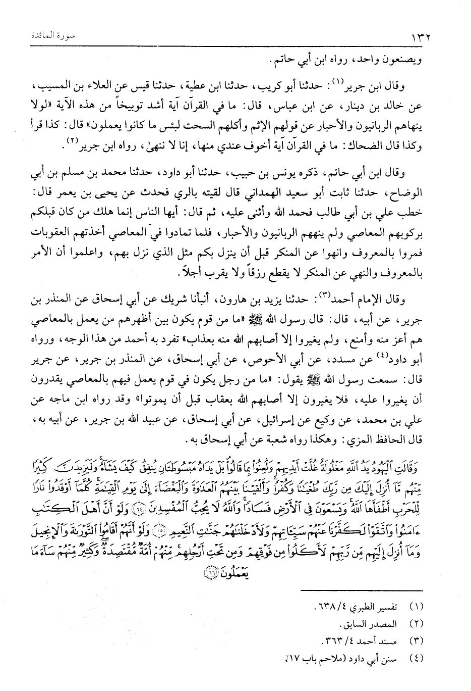 وَقَالَ ابْنُ جَرِيرٍ «1» : حَدَّثَنَا أَبُو كُرَيْبٍ، حَدَّثَنَا ابْنُ عَطِيَّةَ، حَدَّثَنَا قَيْسٌ عَنِ الْعَلَاءِ بْنِ الْمُسَيَّبِ، عَنْ خَالِدِ بْنِ دِينَارٍ، عَنِ ابْنِ عَبَّاسٍ، قَالَ: مَا فِي الْقُرْآنِ آيَةٌ أَشَدُّ تَوْبِيخًا مِنْ هَذِهِ الْآيَةِ «لَوْلَا يَنْهَاهُمُ الرَّبَّانِيُّونَ وَالْأَحْبَارُ عَنْ قَوْلِهِمُ الْإِثْمَ وَأَكْلِهِمُ السُّحْتَ لَبِئْسَ مَا كَانُوا يعملون» قَالَ: كَذَا قَرَأَ وَكَذَا قَالَ الضَّحَّاكُ: مَا فِي الْقُرْآنِ آيَةٌ أَخْوَفُ عِنْدِي مِنْهَا، إِنَّا لَا نَنْهَى، رَوَاهُ ابْنُ جَرِيرٍ «2» .