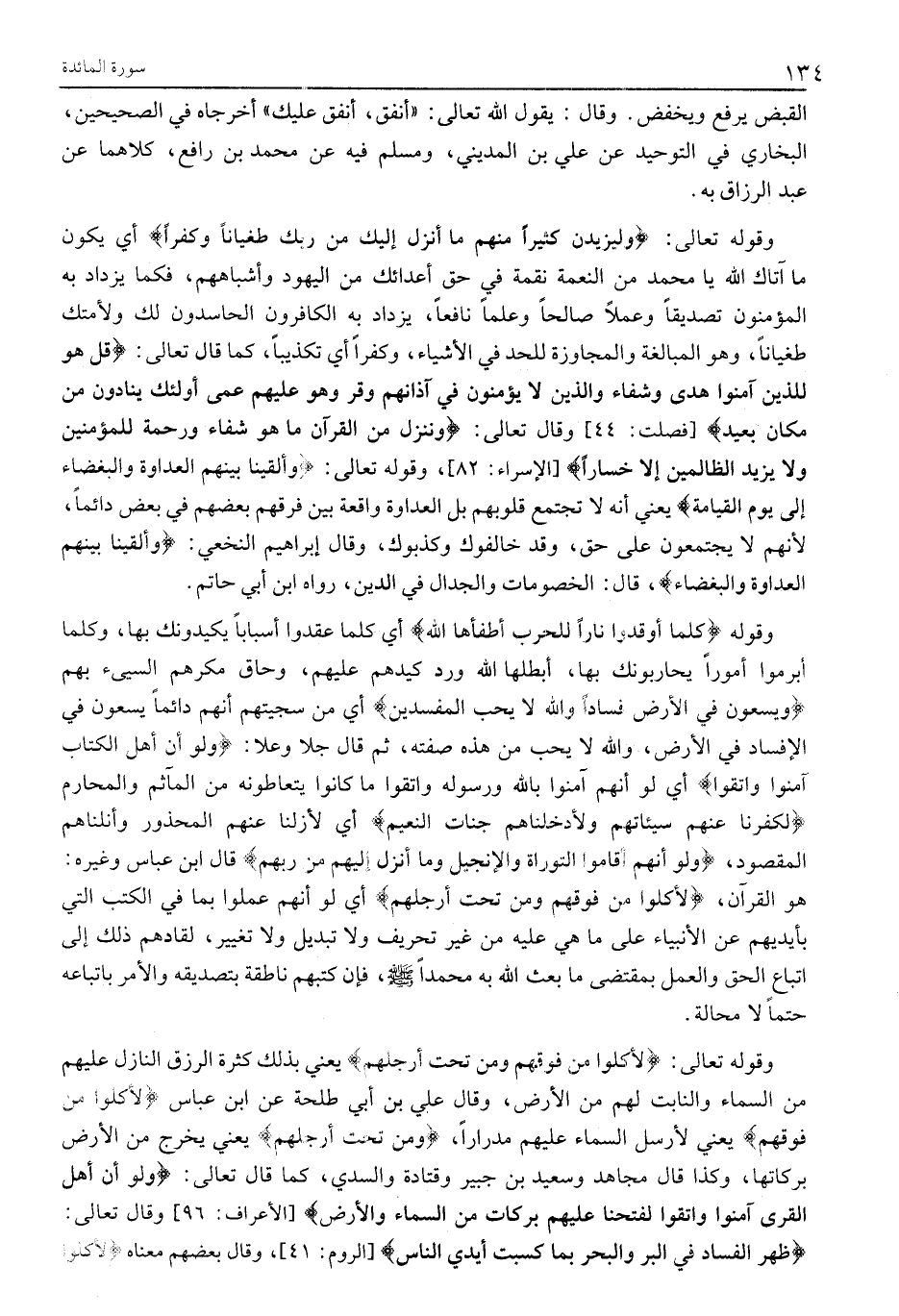 هو الْقُرْآنَ، لَأَكَلُوا مِنْ فَوْقِهِمْ وَمِنْ تَحْتِ أَرْجُلِهِمْ أَيْ لَوْ أَنَّهُمْ عَمِلُوا بِمَا فِي الْكُتُبِ الَّتِي بِأَيْدِيهِمْ عَنِ الْأَنْبِيَاءِ عَلَى مَا هِيَ عليه من غير تحريف ولا تبديل ولا تغيير، لَقَادَهُمْ ذَلِكَ إِلَى اتِّبَاعِ الْحَقِّ وَالْعَمَلِ بِمُقْتَضَى مَا بَعَثَ اللَّهُ بِهِ مُحَمَّدًا صَلَّى اللَّهُ عَلَيْهِ وَسَلَّمَ، فَإِنَّ كُتُبَهُمْ نَاطِقَةٌ بِتَصْدِيقِهِ وَالْأَمْرِ باتباعه حتما لا محالة.