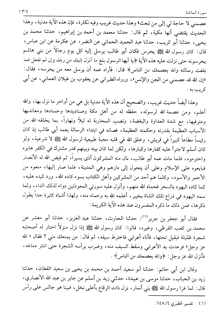 عَصَمَنِي لَا حَاجَةَ لِي إِلَى مَنْ تَبْعَثُ» وَهَذَا حَدِيثٌ غَرِيبٌ وَفِيهِ نَكَارَةٌ، فَإِنَّ هَذِهِ الْآيَةَ مَدَنِيَّةُ، وَهَذَا الْحَدِيثُ يَقْتَضِي أَنَّهَا مَكِّيَّةٌ، ثُمَّ قَالَ: حَدَّثَنَا مُحَمَّدُ بْنُ أَحْمَدَ بْنِ إِبْرَاهِيمَ، حَدَّثَنَا مُحَمَّدُ بْنُ يَحْيَى، حَدَّثَنَا أَبُو كُرَيْبٍ، حَدَّثَنَا عَبْدُ الْحَمِيدِ الْحِمَّانِيُّ عَنِ النَّضْرِ، عَنْ عِكْرِمَةَ عَنِ ابْنِ عَبَّاسٍ، قَالَ: كَانَ رَسُولُ اللَّهِ صَلَّى اللَّهُ عَلَيْهِ وَسَلَّمَ يُحْرَسُ فكان أبو طالب يرسل إليه كُلَّ يَوْمٍ رِجَالًا مِنْ بَنِي هَاشِمٍ يَحْرُسُونَهُ حَتَّى نَزَلَتْ عَلَيْهِ هَذِهِ الْآيَةُ يَا أَيُّهَا الرَّسُولُ بَلِّغْ مَا أُنْزِلَ إِلَيْكَ مِنْ رَبِّكَ وَإِنْ لَمْ تَفْعَلْ فَما بَلَّغْتَ رِسالَتَهُ وَاللَّهُ يَعْصِمُكَ مِنَ النَّاسِ قَالَ: فَأَرَادَ عَمُّهُ أَنْ يُرْسِلَ مَعَهُ مَنْ يَحْرُسُهُ، فَقَالَ:
