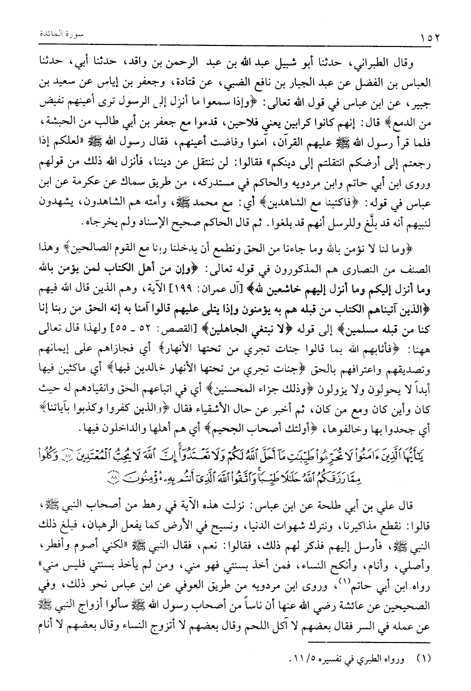 وقال الطبراني، حدثنا أبو شبيل عبد اللَّهِ بْنُ عَبْدِ الرَّحْمَنِ بْنِ وَاقِدٍ، حَدَّثَنَا أَبِي، حَدَّثَنَا الْعَبَّاسُ بْنُ الْفَضْلِ عَنْ عَبْدِ الْجَبَّارِ بْنِ نَافِعٍ الضَّبِّيِّ، عَنْ قَتَادَةَ، وَجَعْفَرِ بْنِ إِيَاسٍ عَنْ سَعِيدِ بْنِ جُبَيْرٍ، عَنِ ابْنِ عَبَّاسٍ في قول الله تعالى: وَإِذا سَمِعُوا مَا أُنْزِلَ إِلَى الرَّسُولِ تَرى أَعْيُنَهُمْ تَفِيضُ مِنَ الدَّمْعِ قَالَ: إِنَّهُمْ كَانُوا كَرَابِينَ يَعْنِي فَلَّاحِينَ، قَدِمُوا مَعَ جَعْفَرِ بْنِ أَبِي طَالِبٍ مِنَ الْحَبَشَةِ، فَلَمَّا قَرَأَ رَسُولُ اللَّهِ صَلَّى اللَّهُ عَلَيْهِ وَسَلَّمَ عَلَيْهِمُ الْقُرْآنَ، آمَنُوا وَفَاضَتْ أَعْيُنُهُمْ، فَقَالَ رَسُولُ اللَّهِ صَلَّى اللَّهُ عَلَيْهِ وَسَلَّمَ «لعلكم إِذَا رَجَعْتُمْ إِلَى أَرْضِكُمُ انْتَقَلْتُمْ إِلَى دِينِكُمْ» فَقَالُوا: لَنْ نَنْتَقِلَ عَنْ دِينِنَا، فَأَنْزَلَ اللَّهُ ذَلِكَ مِنْ قَوْلِهِمْ وَرَوَى ابْنُ أَبِي حَاتِمٍ وَابْنُ مَرْدَوَيْهِ وَالْحَاكِمُ فِي مُسْتَدْرَكِهِ، مِنْ طَرِيقِ سِمَاكٍ عَنْ عِكْرِمَةَ عَنِ ابْنِ عَبَّاسٍ فِي قَوْلِهِ: فَاكْتُبْنا مَعَ الشَّاهِدِينَ أَيْ: مَعَ مُحَمَّدٍ صَلَّى اللَّهُ عَلَيْهِ وَسَلَّمَ، وَأَمَّتِهِ هُمُ الشَّاهِدُونَ، يَشْهَدُونَ لِنَبِيِّهِمْ أَنَّهُ قَدْ بَلَّغَ وَلِلرُّسُلِ أَنَّهُمْ قَدْ بَلَّغُوا. ثُمَّ قَالَ الْحَاكِمُ صَحِيحُ الْإِسْنَادِ وَلَمْ يُخَرِّجَاهُ.