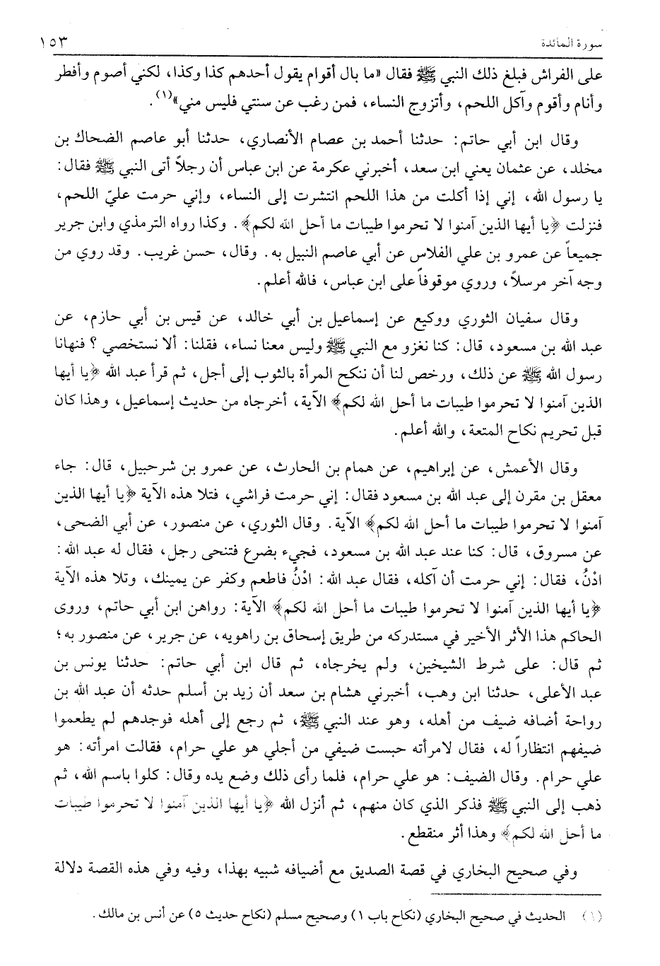 ادْنُ، فَقَالَ: إِنِّي حَرَّمْتُ أَنْ آكُلَهُ، فَقَالَ عَبْدُ اللَّهِ: ادْنُ فَاطْعَمْ وَكَفِّرْ عَنْ يَمِينِكَ، وَتَلَا هَذِهِ الْآيَةَ يَا أَيُّهَا الَّذِينَ آمَنُوا لَا تُحَرِّمُوا طَيِّباتِ مَا أَحَلَّ اللَّهُ لَكُمْ الْآيَةَ: رَوَاهُنَّ ابْنُ أَبِي حَاتِمٍ، وَرَوَى الْحَاكِمُ هَذَا الْأَثَرَ الْأَخِيرَ فِي مستدركه من طريق إسحاق بن رَاهْوَيْهِ، عَنْ جَرِيرٍ، عَنْ مَنْصُورٍ بِهِ ثُمَّ قَالَ: عَلَى شَرْطِ الشَّيْخَيْنِ، وَلَمْ يُخَرِّجَاهُ، ثُمَّ قَالَ ابْنُ أَبِي حَاتِمٍ: حَدَّثَنَا يُونُسُ بْنُ عَبْدِ الْأَعْلَى، حَدَّثَنَا ابْنُ وَهْبٍ، أَخْبَرَنِي هِشَامُ بْنُ سَعْدٍ أَنَّ زَيْدَ بْنَ أَسْلَمَ حَدَّثَهُ أن عبد الله بن رواحة أضافه ضَيْفٌ مِنْ أَهْلِهِ، وَهُوَ عِنْدَ النَّبِيِّ صَلَّى اللَّهُ عَلَيْهِ وَسَلَّمَ، ثُمَّ رَجَعَ إِلَى أَهْلِهِ فَوَجَدَهُمْ لَمْ يُطْعِمُوا ضَيْفَهُمُ انْتِظَارًا لَهُ، فَقَالَ لِامْرَأَتِهِ حَبَسْتِ ضَيْفِي مِنْ أَجْلِي هُوَ عَلَيَّ حَرَامٌ، فَقَالَتِ امْرَأَتُهُ: هُوَ عَلَيَّ حَرَامٌ. وَقَالَ الضَّيْفُ: هُوَ عَلَيَّ حَرَامٌ، فَلَمَّا رَأَى ذَلِكَ وَضَعَ يَدَهَ وَقَالَ: كُلُوا بِاسْمِ اللَّهِ، ثُمَّ ذَهَبَ إِلَى النَّبِيِّ صَلَّى اللَّهُ عَلَيْهِ وَسَلَّمَ فَذَكَرَ الَّذِي كَانَ مِنْهُمْ، ثُمَّ أَنْزَلَ اللَّهُ يَا أَيُّهَا الَّذِينَ آمَنُوا لَا تُحَرِّمُوا طَيِّباتِ مَا أَحَلَّ اللَّهُ لَكُمْ وَهَذَا أَثَرٌ مُنْقَطِعٌ.