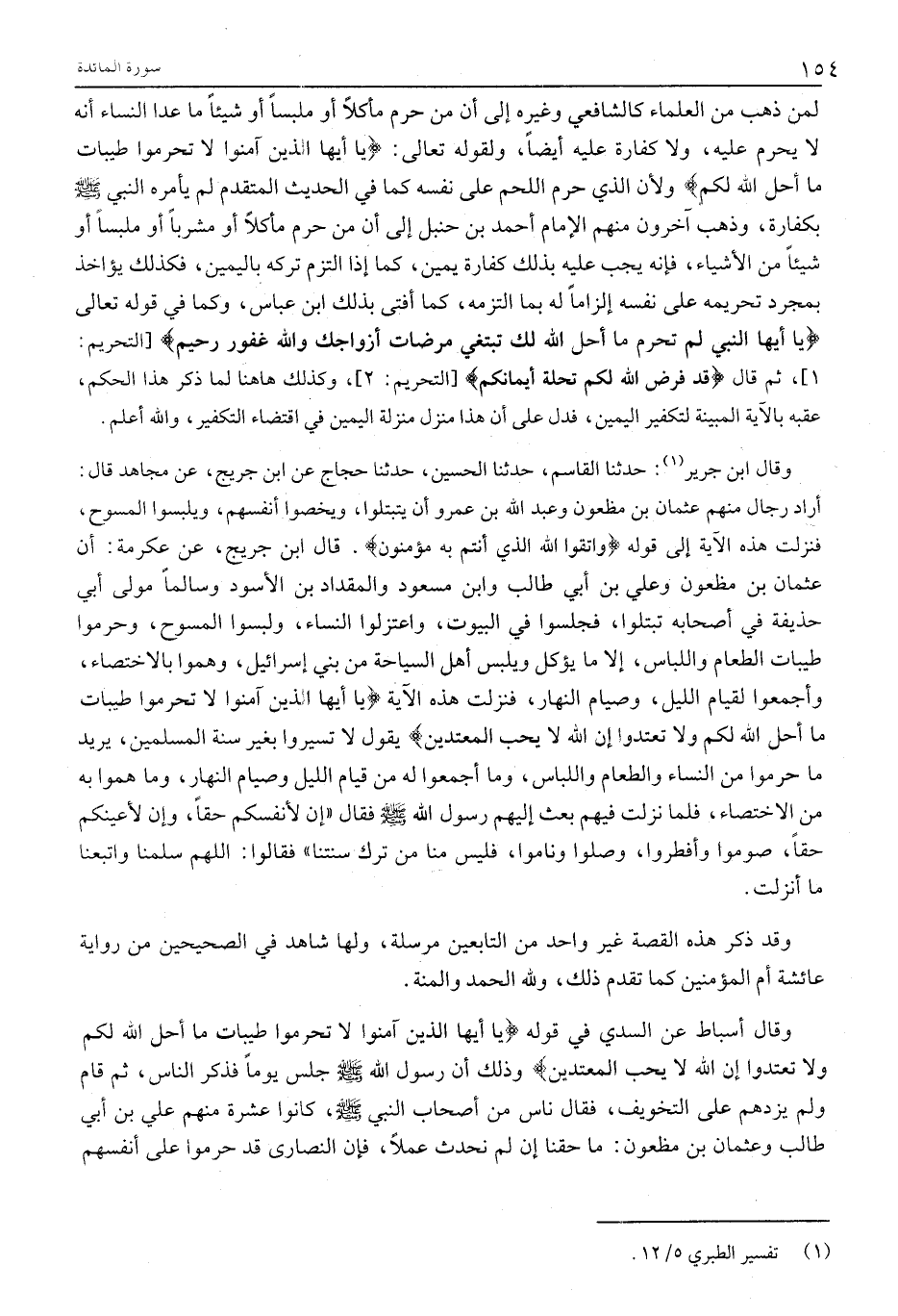 أَرَادَ رِجَالٌ مِنْهُمْ عُثْمَانُ بْنُ مَظْعُونٍ وَعَبْدُ اللَّهِ بْنُ عَمْرٍو أَنَّ يَتَبَتَّلُوا، وَيَخْصُوا أَنْفُسَهُمْ، وَيَلْبَسُوا الْمُسُوحَ، فَنَزَلَتْ هَذِهِ الْآيَةُ إِلَى قَوْلِهِ وَاتَّقُوا اللَّهَ الَّذِي أَنْتُمْ بِهِ مُؤْمِنُونَ. قَالَ ابْنُ جُرَيْجٍ، عَنْ عِكْرِمَةَ: أَنَّ عُثْمَانَ بْنَ مَظْعُونٍ وَعَلِيَّ بْنَ أَبِي طَالِبٍ وَابْنَ مَسْعُودٍ وَالْمِقْدَادَ بْنَ الْأَسْوَدِ وسالما مولى أبي حذيفة في أصحابه تَبَتَّلُوا، فَجَلَسُوا فِي الْبُيُوتِ، وَاعْتَزَلُوا النِّسَاءَ، وَلَبِسُوا الْمُسُوحَ، وَحَرَّمُوا طَيِّبَاتِ الطَّعَامِ وَاللِّبَاسِ، إِلَّا مَا يؤكل وَيَلْبَسُ أَهْلُ السِّيَاحَةِ مِنْ بَنِي إِسْرَائِيلَ، وَهَمُّوا بالاختصاء، وأجمعوا لقيام الليل، وصيام النهار، فَنَزَلَتْ هَذِهِ الْآيَةُ يَا أَيُّهَا الَّذِينَ آمَنُوا لَا تُحَرِّمُوا طَيِّباتِ مَا أَحَلَّ اللَّهُ لَكُمْ وَلا تَعْتَدُوا إِنَّ اللَّهَ لَا يُحِبُّ الْمُعْتَدِينَ يَقُولُ لَا تَسِيرُوا بِغَيْرِ سُنَّةِ الْمُسْلِمِينَ، يُرِيدُ مَا حَرَّمُوا مِنَ النِّسَاءِ وَالطَّعَامِ وَاللِّبَاسِ، وَمَا أجمعوا له مِنْ قِيَامِ اللَّيْلِ وَصِيَامِ النَّهَارِ، وَمَا هَمُّوا به من الاختصاء، فَلَمَّا نَزَلَتْ فِيهِمْ بَعَثَ إِلَيْهِمْ رَسُولُ اللَّهِ صَلَّى اللَّهُ عَلَيْهِ وَسَلَّمَ فَقَالَ «إِنَّ لِأَنْفُسِكُمْ حَقًّا، وَإِنَّ لِأَعْيُنِكُمْ حَقًّا، صُومُوا وَأَفْطِرُوا، وَصَلُّوا وَنَامُوا، فَلَيْسَ مِنَّا مَنْ تَرَكَ سُنَّتَنَا» فَقَالُوا: اللَّهُمَّ سَلَّمْنَا وَاتَّبَعْنَا مَا أَنْزَلَتْ.