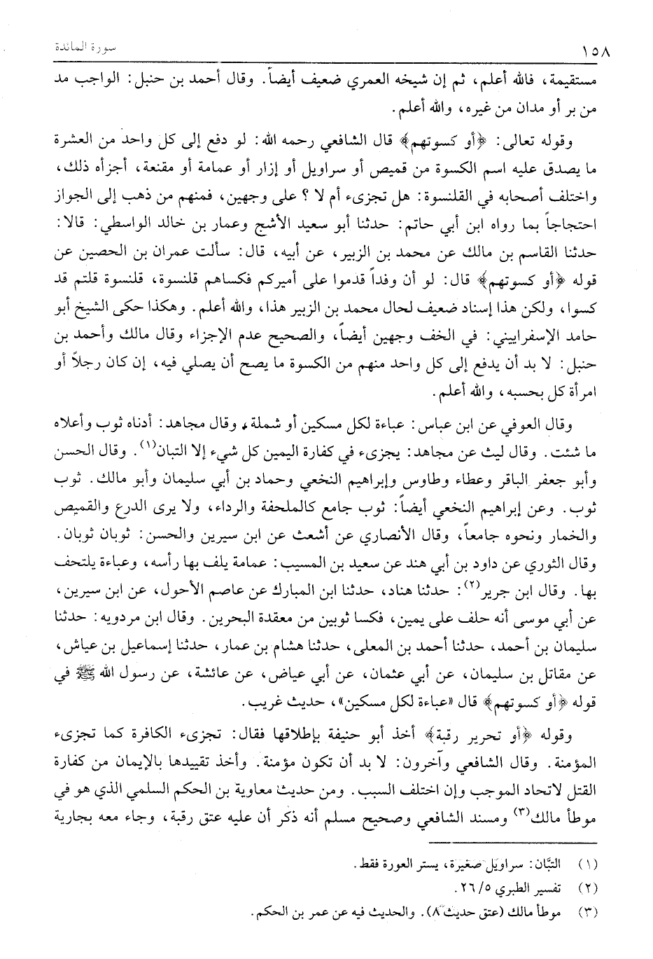 حَدَّثَنَا الْقَاسِمُ بْنُ مَالِكٍ عَنْ مُحَمَّدِ بْنِ الزُّبَيْرِ، عَنْ أَبِيهِ، قال: سألت عمران بن الحصين عَنْ قَوْلِهِ أَوْ كِسْوَتُهُمْ قَالَ: لَوْ أَنَّ وفدا قدموا على أميركم فكساهم قَلَنْسُوَةً، قَلَنْسُوَةً قُلْتُمْ قَدْ كُسُوا، وَلَكِنَّ هَذَا إِسْنَادٌ ضَعِيفٌ لِحَالِ مُحَمَّدِ بْنِ الزُّبَيْرِ هَذَا، وَاللَّهُ أَعْلَمُ. وَهَكَذَا حَكَى الشَّيْخُ أَبُو حَامِدٍ الإسفراييني: فِي الْخُفِّ وَجْهَيْنِ أَيْضًا، وَالصَّحِيحُ عَدَمُ الْإِجْزَاءِ وَقَالَ مَالِكٌ وَأَحْمَدُ بْنُ حَنْبَلٍ: لَا بُدَّ أَنْ يَدْفَعَ إِلَى كُلٍّ وَاحِدٍ مِنْهُمْ مَنِ الْكُسْوَةِ مَا يَصِحُّ أَنْ يُصَلِّيَ فِيهِ، إِنْ كَانَ رَجُلًا أَوِ امْرَأَةً كُلٌّ بِحَسْبِهِ، وَاللَّهُ أَعْلَمُ.