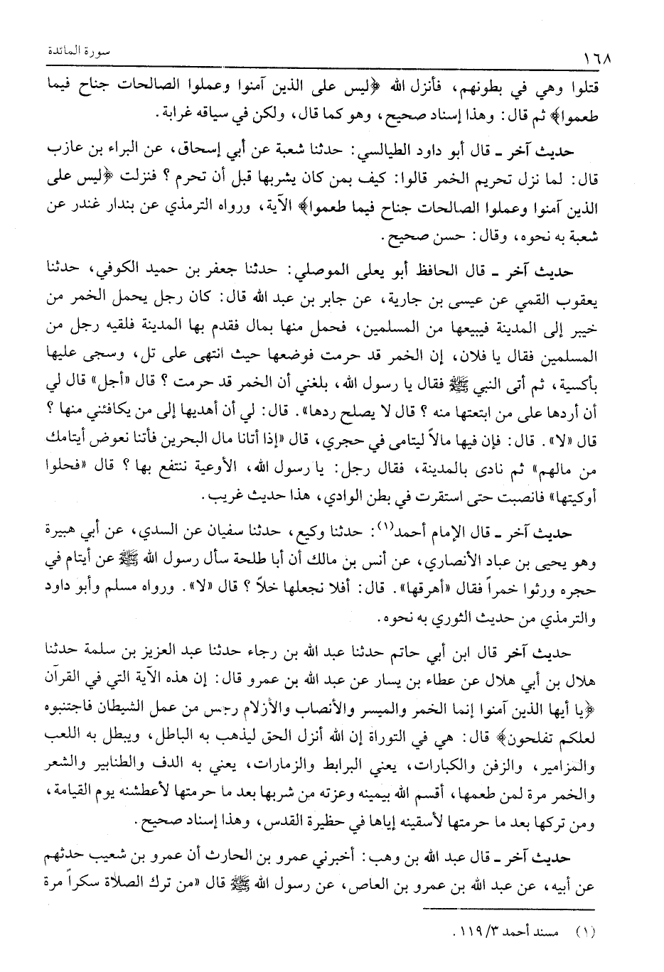 حَدِيثٌ آخَرُ- قَالَ أَبُو دَاوُدَ الطَّيَالِسِيُّ: حَدَّثَنَا شُعْبَةُ عَنْ أَبِي إِسْحَاقَ، عَنِ الْبَرَاءِ بْنِ عَازِبٍ قَالَ: لَمَّا نَزَلَ تَحْرِيمُ الْخَمْرِ قَالُوا: كَيْفَ بِمَنْ كَانَ يَشْرَبُهَا قَبْلَ أَنْ تَحْرُمَ؟ فَنَزَلَتْ لَيْسَ عَلَى الَّذِينَ آمَنُوا وَعَمِلُوا الصَّالِحاتِ جُناحٌ فِيما طَعِمُوا الْآيَةَ، وَرَوَاهُ التِّرْمِذِيُّ عن بندار غندر عن شعبة به نحوه، وَقَالَ: حَسَنٌ صَحِيحٌ.
