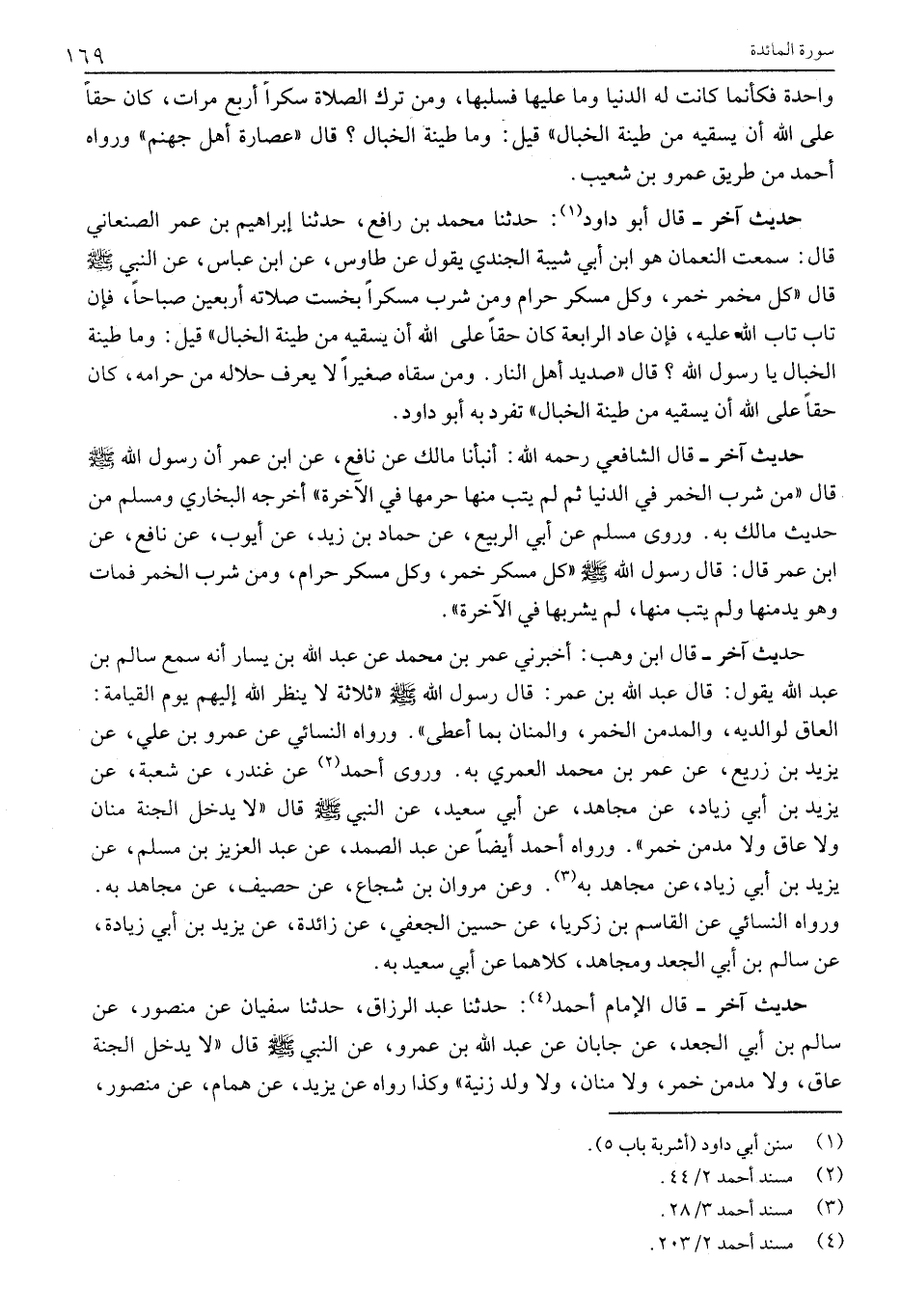 حَدِيثٌ آخَرُ- قَالَ أَبُو دَاوُدَ «1» : حَدَّثَنَا مُحَمَّدُ بْنُ رَافِعٍ، حَدَّثَنَا إِبْرَاهِيمُ بْنُ عُمَرَ الصَّنْعَانِيُّ قَالَ: سَمِعْتُ النُّعْمَانَ هُوَ ابْنُ أَبِي شَيْبَةَ الْجَنَدِيُّ يَقُولُ عَنْ طَاوُسٍ، عَنِ ابْنِ عَبَّاسٍ، عَنِ النَّبِيِّ صَلَّى اللَّهُ عَلَيْهِ وَسَلَّمَ قَالَ «كُلُّ مُخَمَّرٍ خَمْرٌ، وَكُلُّ مُسْكِرٍ حَرَامٌ وَمَنْ شَرِبَ مُسْكِرًا بُخِسَتْ صَلَاتُهُ أَرْبَعِينَ صَبَاحًا، فَإِنْ تَابَ تَابَ اللَّهُ عَلَيْهِ، فَإِنْ عَادَ الرَّابِعَةَ كَانَ حَقًّا عَلَى اللَّهِ أَنْ يَسْقِيَهُ مِنْ طينة الخبال» قيل: وما طِينَةُ الْخَبَالِ يَا رَسُولَ اللَّهِ؟ قَالَ «صَدِيدُ أَهْلِ النَّارِ. وَمَنْ سَقَاهُ صَغِيرًا لَا يَعْرِفُ حَلَالَهُ مِنْ حَرَامِهِ، كَانَ حَقًّا عَلَى اللَّهِ أَنْ يَسْقِيَهُ مِنْ طِينَةِ الْخَبَالِ» تَفَرَّدَ بِهِ أَبُو دَاوُدَ.
