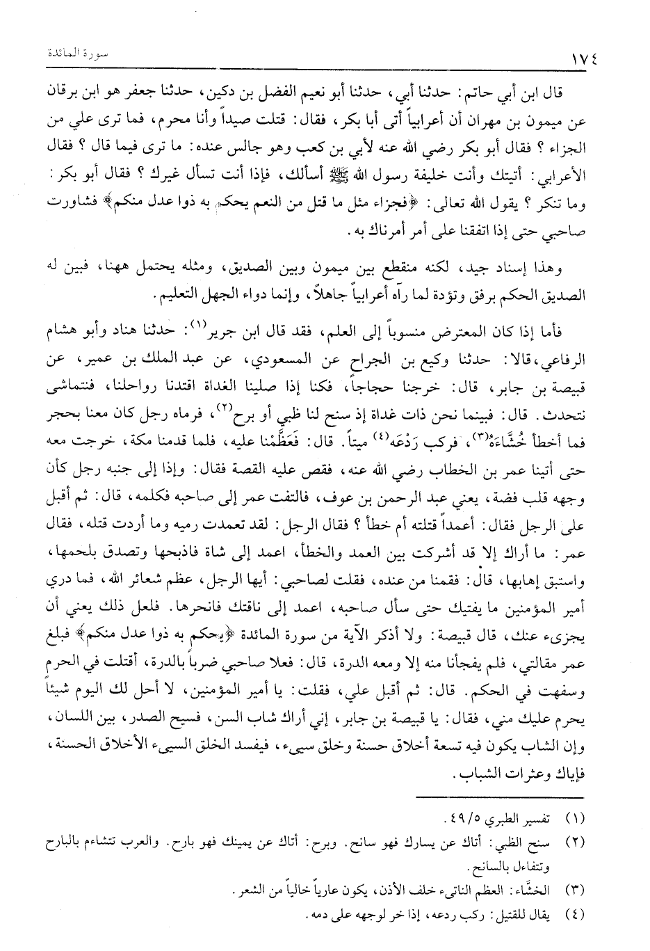 فَأَمَّا إِذَا كَانَ الْمُعْتَرِضُ مَنْسُوبًا إِلَى الْعِلْمِ، فَقَدْ قَالَ ابْنُ جَرِيرٍ «1» : حَدَّثَنَا هَنَّادٌ وَأَبُو هِشَامٍ الرِّفَاعِيُّ، قَالَا: حَدَّثَنَا وَكِيعُ بْنُ الْجَرَّاحِ عَنِ الْمَسْعُودِيِّ، عَنْ عَبْدِ الْمَلِكِ بْنِ عُمَيْرٍ، عَنْ قَبِيصَةَ بْنِ جَابِرٍ، قَالَ: خَرَجْنَا حُجَّاجًا، فَكُنَّا إِذَا صَلَّيْنَا الغداة اقتدنا رواحلنا، فنتماشى نَتَحَدَّثُ. قَالَ: فَبَيْنَمَا نَحْنُ ذَاتَ غَدَاةٍ إِذْ سَنَحَ لَنَا ظَبْيٌ أَوْ بَرِحَ «2» ، فَرَمَاهُ رَجُلٌ كَانَ مَعَنَا بِحَجَرٍ فَمَا أَخْطَأَ خُشَّاءَهُ «3» ، فَرَكِبَ رَدْعَهُ «4» مَيِّتًا. قَالَ: فَعَظَّمْنَا عَلَيْهِ، فَلَمَّا قَدِمْنَا مكة، خرجت معه حتى أتينا عمر بن الخطاب رضي الله عنه، فقص عليه القصة فقال: وإذا إلى جَنْبِهِ رَجُلٌ كَأَنَّ وَجْهَهُ قُلْبُ فِضَّةٍ، يَعْنِي عَبْدَ الرَّحْمَنِ بْنَ عَوْفٍ، فَالْتَفَتَ عُمَرُ إِلَى صَاحِبِهِ فَكَلَّمَهُ، قَالَ: ثُمَّ أَقْبَلَ عَلَى الرَّجُلِ فقال: أعمدا قتلته أم خطأ؟ فقال الرَّجُلُ: لَقَدْ تَعَمَّدْتُ رَمْيَهُ وَمَا أَرَدْتُ قَتْلَهُ، فَقَالَ عُمَرُ: مَا أَرَاكَ إِلَّا قَدْ أَشْرَكْتَ بَيْنَ الْعَمْدِ وَالْخَطَأِ، اعْمَدْ إِلَى شَاةٍ فَاذْبَحْهَا وَتَصَدَّقْ بِلَحْمِهَا، وَاسْتَبْقِ إِهَابَهَا، قَالَ: فَقُمْنَا مِنْ عِنْدِهِ، فَقُلْتُ لِصَاحِبِي: أَيُّهَا الرَّجُلُ، عَظِّمْ شَعَائِرَ اللَّهِ، فَمَا دَرَى أَمِيرُ الْمُؤْمِنِينَ مَا يُفْتِيكَ حَتَّى سَأَلَ صَاحِبَهُ، اعْمَدْ إِلَى نَاقَتِكَ فَانْحَرْهَا. فلعل ذلك يعني أن يجزئ عنك، قَالَ قَبِيصَةُ: وَلَا أَذْكُرُ الْآيَةَ مِنْ سُورَةِ المائدة يَحْكُمُ بِهِ ذَوا عَدْلٍ مِنْكُمْ فَبَلَغَ عُمَرَ مَقَالَتِي، فَلَمْ يَفْجَأْنَا مِنْهُ إِلَّا وَمَعَهُ الدِّرَّةُ، قَالَ: فَعَلَا صَاحِبِي ضَرْبًا بِالدِّرَّةِ، أقتلت في الحرم وسفهت في الْحُكْمَ. قَالَ: ثُمَّ أَقْبَلَ عَلَيَّ، فَقُلْتُ: يَا أَمِيرَ الْمُؤْمِنِينَ، لَا أُحِلُّ لَكَ الْيَوْمَ شَيْئًا يحرم عليك مني، فقال: يَا قَبِيصَةَ بْنَ جَابِرٍ، إِنِّي أَرَاكَ شَابَّ السِّنِّ، فَسِيحَ الصَّدْرِ، بَيِّنَ اللِّسَانِ، وَإِنَّ الشَّابَّ يَكُونُ فِيهِ تِسْعَةُ أَخْلَاقٍ حَسَنَةٍ وَخُلُقٌ سَيِّئٌ، فَيُفْسِدُ الْخُلُقُ السَّيِّئُ الْأَخْلَاقَ الْحَسَنَةَ، فَإِيَّاكَ وَعَثَرَاتِ الشباب.