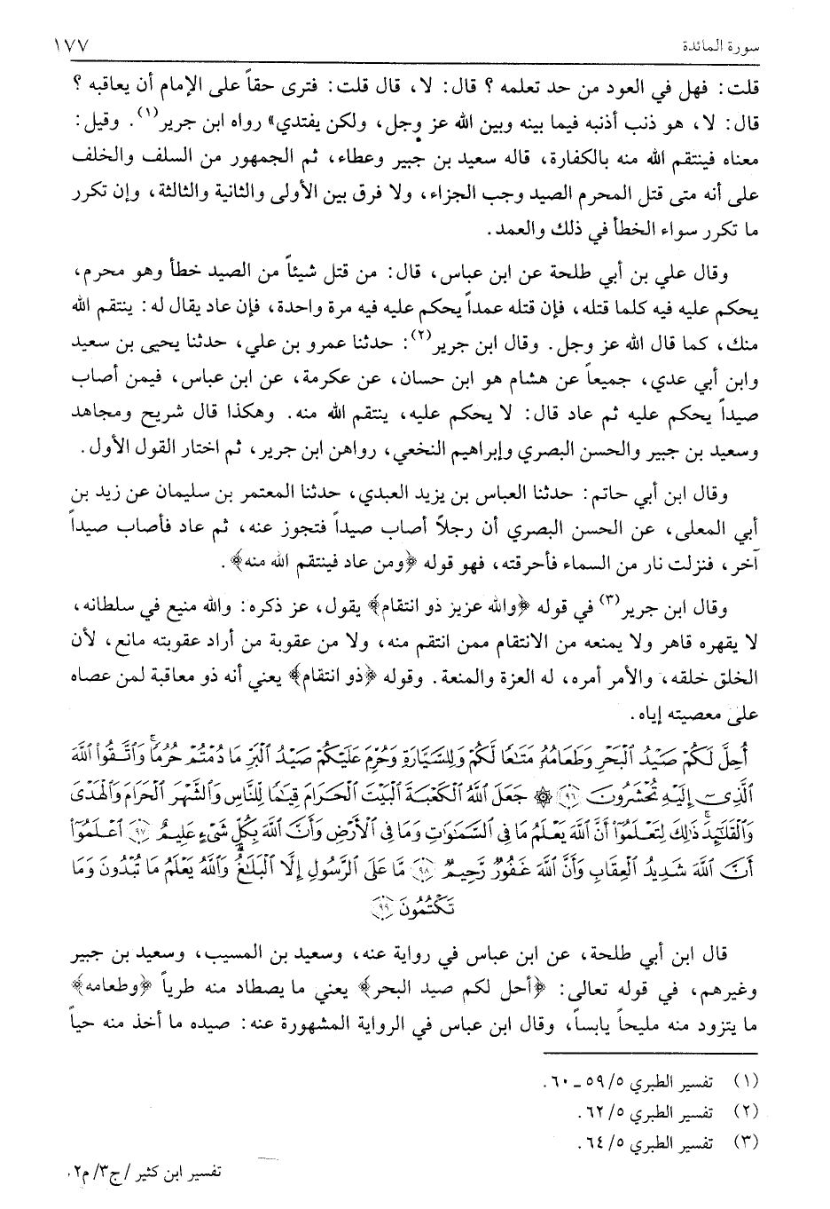 وَقَالَ عَلِيُّ بْنُ أَبِي طَلْحَةَ عَنِ ابْنِ عَبَّاسٍ، قَالَ: مَنْ قَتَلَ شَيْئًا مِنَ الصَّيْدِ خَطَأً وَهُوَ مُحْرِمٌ، يُحْكَمُ عَلَيْهِ فيه كلما قتله، فإن قَتْلَهُ عَمْدًا يُحْكَمُ عَلَيْهِ فِيهِ مَرَّةً وَاحِدَةً، فَإِنْ عَادَ يُقَالُ لَهُ: يَنْتَقِمُ اللَّهُ مِنْكَ، كَمَا قَالَ اللَّهُ عَزَّ وَجَلَّ. وَقَالَ ابْنُ جَرِيرٍ «2» : حَدَّثَنَا عَمْرُو بْنُ عَلِيٍّ، حَدَّثَنَا يَحْيَى بْنُ سَعِيدٍ وَابْنُ أَبِي عَدِيٍّ، جَمِيعًا عَنْ هِشَامٍ هُوَ ابْنُ حَسَّانٍ، عَنْ عِكْرِمَةَ، عَنِ ابن عباس، فيمن أصاب صيدا يحكم عَلَيْهِ ثُمَّ عَادَ قَالَ: لَا يُحْكَمُ عَلَيْهِ، يَنْتَقِمُ اللَّهُ مِنْهُ. وَهَكَذَا قَالَ شُرَيْحٌ وَمُجَاهِدٌ وَسَعِيدُ بْنُ جُبَيْرٍ وَالْحَسَنُ الْبَصْرِيُّ وَإِبْرَاهِيمُ النَّخَعِيُّ، رَوَاهُنَّ ابْنُ جَرِيرٍ، ثُمَّ اخْتَارَ الْقَوْلَ الْأَوَّلَ.