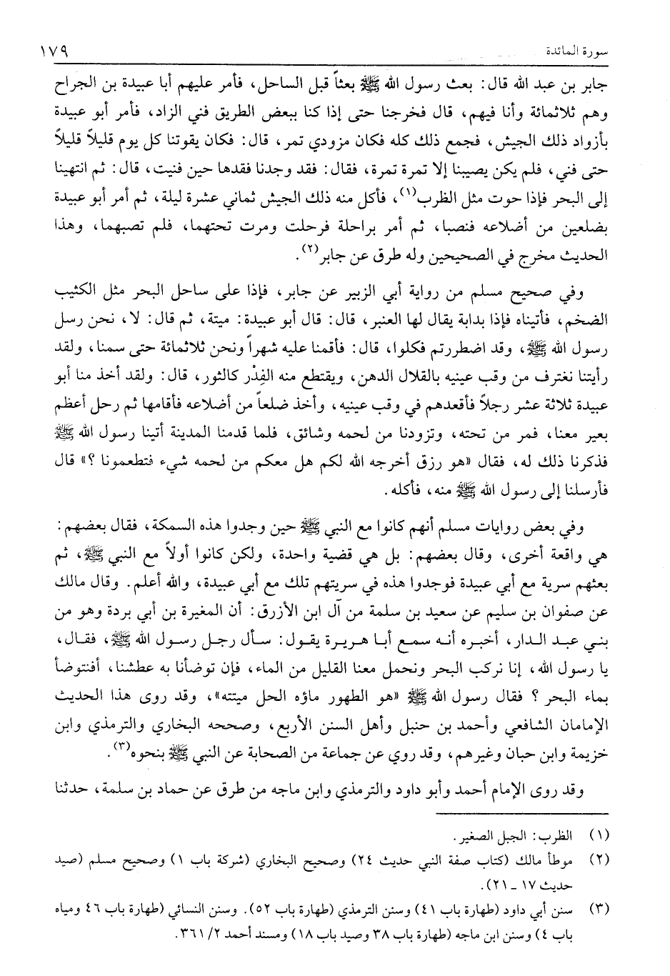(3) سنن أبي داود (طهارة باب 41) وسنن الترمذي (طهارة باب 52) . وسنن النسائي (طهارة باب 46 ومياه باب 4) وسنن ابن ماجة (طهارة باب 38 وصيد باب 18) ومسند أحمد 2/ 361.