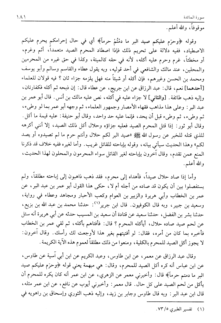 لَا يَجُوزُ أَكْلُ الصَّيْدِ لِلْمُحْرمِ بِالْكُلِّيَّةِ، وَمَنَعُوا مِنْ ذَلِكَ مُطْلَقًا لِعُمُومِ هَذِهِ الْآيَةِ الْكَرِيمَةِ.