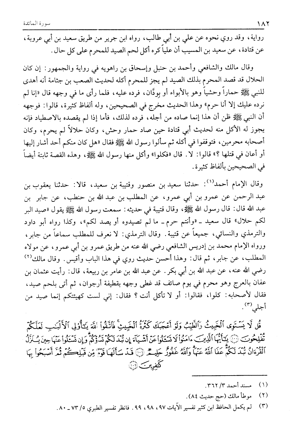 : حَدَّثَنَا سَعِيدُ بْنُ مَنْصُورٍ وَقُتَيْبَةُ بْنُ سَعِيدٍ، قَالَا: حَدَّثَنَا يَعْقُوبُ بْنُ عَبْدِ الرَّحْمَنِ عَنْ عَمْرِو بْنِ أَبِي عَمْرٍو، عَنِ الْمُطَّلِبِ بْنِ عَبْدِ اللَّهِ بْنِ حَنْطَبٍ، عَنْ جَابِرِ بْنِ عَبْدِ اللَّهِ قَالَ: قَالَ رَسُولُ اللَّهِ صَلَّى اللَّهُ عَلَيْهِ وَسَلَّمَ، وَقَالَ قُتَيْبَةُ فِي حَدِيثِهِ: سَمِعْتُ رَسُولَ اللَّهِ صَلَّى اللَّهُ عَلَيْهِ وَسَلَّمَ يَقُولُ «صَيْدُ الْبَرِّ لَكُمْ حَلَالٌ» قَالَ سَعِيدٌ- «وَأَنْتُمْ حُرُمٌ- مَا لَمْ تَصِيدُوهُ أَوْ يُصَدْ لَكُمْ» ، وَكَذَا رَوَاهُ أَبُو دَاوُدَ وَالتِّرْمِذِيُّ وَالنَّسَائِيُّ، جَمِيعًا عَنْ قُتَيْبَةَ. وَقَالَ التِّرْمِذِيُّ: لَا نَعْرِفُ لِلْمُطَّلِبِ سَمَاعًا مِنْ جَابِرٍ، وَرَوَاهُ الإمام محمد بن إدريس الشافعي رضي الله عنه مِنْ طَرِيقِ عَمْرِو بْنِ أَبِي عَمْرٍو، عَنْ مَوْلَاهُ الْمُطَّلِبِ، عَنْ جَابِرٍ، ثُمَّ قَالَ: وَهَذَا أَحْسَنُ حَدِيثٍ رُوِيَ فِي هَذَا الْبَابِ وَأَقْيَسُ. وقال مالك «2» رضي الله عنه، عَنْ عَبْدِ اللَّهِ بْنِ أَبِي بَكْرٍ. عَنْ عَبْدِ اللَّهِ بْنِ عَامِرِ بْنِ رَبِيعَةَ، قَالَ: رَأَيْتُ عُثْمَانَ بْنَ عَفَّانَ بِالْعَرْجِ وَهُوَ مُحْرِمٌ فِي يَوْمٍ صَائِفٍ قَدْ غَطَّى وَجْهَهُ بِقَطِيفَةِ أُرْجُوَانَ، ثُمَّ أُتِيَ بِلَحْمِ صَيْدٍ، فَقَالَ لِأَصْحَابِهِ: كلوا، فقالوا: أو لا تَأْكُلُ أَنْتَ؟ فَقَالَ: إِنِّي لَسْتُ كَهَيْئَتِكُمْ إِنَّمَا صيد من أجلي «3» .