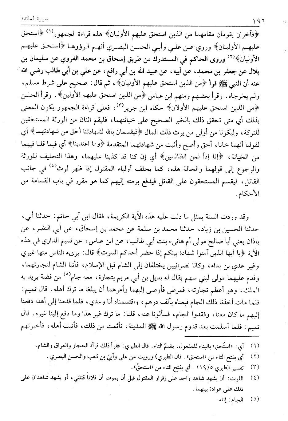 فَآخَرانِ يَقُومانِ مَقامَهُما مِنَ الَّذِينَ اسْتَحَقَّ عَلَيْهِمُ الْأَوْلَيانِ هَذِهِ قِرَاءَةُ الْجُمْهُورِ «1» اسْتَحَقَّ عَلَيْهِمُ الْأَوْلَيانِ وروي عن علي وأبي الحسن البصري أنهم قرءوها اسْتَحَقَّ عَلَيْهِمُ الْأَوْلَيانِ «2» وروى الْحَاكِمُ فِي الْمُسْتَدْرَكِ مِنْ طَرِيقِ إِسْحَاقَ بْنِ مُحَمَّدِ الْفَرْوِيِّ عَنْ سُلَيْمَانَ بْنِ بِلَالٍ عَنْ جَعْفَرِ بْنِ مُحَمَّدٍ، عَنْ أَبِيهِ، عَنْ عُبَيْدِ اللَّهِ بْنِ أَبِي رَافِعٍ، عَنْ عَلِيِّ بْنِ أَبِي طَالِبٍ رَضِيَ اللَّهُ عَنْهُ أَنَّ النَّبِيَّ صَلَّى اللَّهُ عَلَيْهِ وَسَلَّمَ قَرَأَ مِنَ الَّذِينَ اسْتَحَقَّ عَلَيْهِمُ الْأَوْلَيانِ، ثُمَّ قَالَ: صَحِيحٌ عَلَى شَرْطِ مُسْلِمٍ، وَلَمْ يُخَرِّجَاهُ. وَقَرَأَ بَعْضُهُمْ وَمِنْهُمُ ابْنُ عَبَّاسٍ مِنَ الَّذِينَ اسْتَحَقَّ عَلَيْهِمُ الْأَوَّلِينَ. وَقَرَأَ الْحَسَنُ مِنَ الَّذِينَ اسْتَحَقَّ عَلَيْهِمُ الْأَوَّلَانِ حَكَاهُ ابْنُ جَرِيرٍ»
