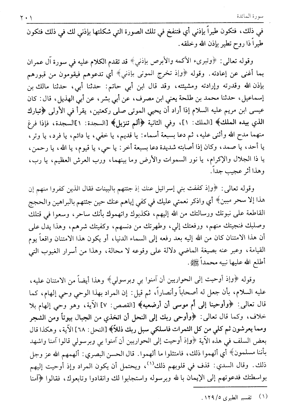 وقوله تعالى: وَتُبْرِئُ الْأَكْمَهَ وَالْأَبْرَصَ بِإِذْنِي قَدْ تَقَدَّمَ الْكَلَامُ عليه فِي سُورَةِ آلِ عِمْرَانَ بِمَا أَغْنَى عَنْ إِعَادَتِهِ. وَقَوْلُهُ وَإِذْ تُخْرِجُ الْمَوْتى بِإِذْنِي أَيْ تَدْعُوهُمْ فَيَقُومُونَ مِنْ قُبُورِهِمْ بِإِذْنِ اللَّهِ وَقُدْرَتِهِ وَإِرَادَتِهِ وَمَشِيئَتِهِ، وَقَدْ قَالَ ابْنُ أَبِي حَاتِمٍ: حَدَّثَنَا أَبِي، حَدَّثَنَا مَالِكُ بْنُ إِسْمَاعِيلَ، حَدَّثَنَا مُحَمَّدُ بْنُ طَلْحَةَ يَعْنِي ابْنَ مُصَرِّفٍ، عَنْ أَبِي بِشْرٍ، عَنْ أَبِي الْهُذَيْلِ، قَالَ: كَانَ عِيسَى ابْنُ مَرْيَمَ عَلَيْهِ السَّلَامُ إِذَا أَرَادَ أَنْ يُحَيِيَ الْمَوْتَى صَلَّى رَكْعَتَيْنِ، يَقْرَأُ فِي الأولى تَبارَكَ الَّذِي بِيَدِهِ الْمُلْكُ [الملك: 1] ، وفي الثانية الم تَنْزِيلُ [السجدة: 1] السَّجْدَةِ، فَإِذَا فَرَغَ مِنْهُمَا مَدَحَ اللَّهَ وَأَثْنَى عَلَيْهِ، ثُمَّ دَعَا بِسَبْعَةِ أَسْمَاءَ: يَا قَدِيمُ، يَا خَفِيُّ، يَا دَائِمُ، يَا فَرْدُ، يَا وَتْرُ، يَا أَحَدُ، يَا صَمَدُ، وَكَانَ إِذَا أصابته شديدة دَعَا بِسَبْعَةٍ أُخَرَ: يَا حَيُّ، يَا قَيُّومُ، يَا اللَّهُ، يَا رَحْمَنُ، يَا ذَا الْجَلَالِ وَالْإِكْرَامِ، يَا نُورَ السَّمَوَاتِ وَالْأَرْضِ وَمَا بَيْنَهُمَا، وَرَبَّ الْعَرْشِ الْعَظِيمِ، يَا رَبِّ، وَهَذَا أَثَرٌ عجيب جدا.