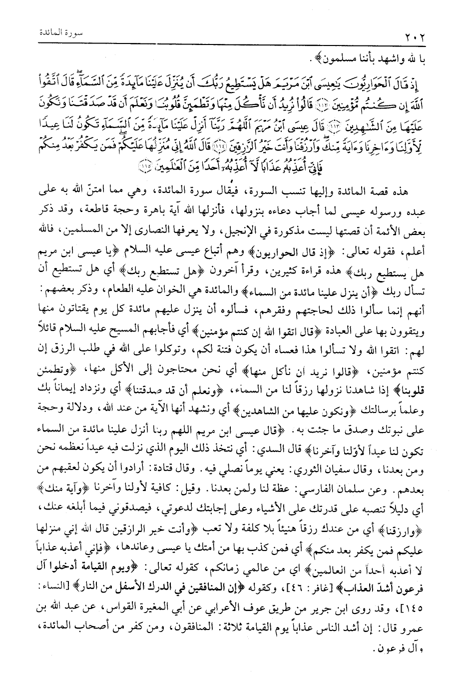 أَنَّهُمْ إِنَّمَا سَأَلُوا ذَلِكَ لِحَاجَتِهِمْ وفقرهم، فسألوه أَنْ يَنْزِلَ عَلَيْهِمْ مَائِدَةٌ كُلَّ يَوْمٍ يَقْتَاتُونَ مِنْهَا وَيَتَقَوَّوْنَ بِهَا عَلَى الْعِبَادَةِ قالَ اتَّقُوا اللَّهَ إِنْ كُنْتُمْ مُؤْمِنِينَ أَيْ فَأَجَابَهُمُ الْمَسِيحُ عَلَيْهِ السَّلَامُ قَائِلًا لَهُمُ: اتَّقُوا اللَّهَ وَلَا تَسْأَلُوا هَذَا فَعَسَاهُ أَنْ يَكُونَ فِتْنَةً لَكُمْ، وَتَوَكَّلُوا عَلَى اللَّهِ فِي طَلَبِ الرِّزْقِ إِنْ كُنْتُمْ مُؤْمِنِينَ، قالُوا نُرِيدُ أَنْ نَأْكُلَ مِنْها أَيْ نَحْنُ مُحْتَاجُونَ إِلَى الْأَكْلِ مِنْهَا، وَتَطْمَئِنَّ قُلُوبُنا إِذَا شَاهَدْنَا نُزُولَهَا رِزْقًا لَنَا مِنَ السَّمَاءِ، وَنَعْلَمَ أَنْ قَدْ صَدَقْتَنا أَيْ وَنَزْدَادَ إِيمَانًا بِكَ وَعِلْمًا بِرِسَالَتِكَ وَنَكُونَ عَلَيْها مِنَ الشَّاهِدِينَ أي ونشهد أنها الآية مِنْ عِنْدِ اللَّهِ، وَدَلَالَةٌ وَحُجَّةٌ عَلَى نُبُوَّتِكَ وَصِدْقِ مَا جِئْتَ بِهِ. قالَ عِيسَى ابْنُ مَرْيَمَ اللَّهُمَّ رَبَّنا أَنْزِلْ عَلَيْنا مائِدَةً مِنَ السَّماءِ تَكُونُ لَنا عِيداً لِأَوَّلِنا وَآخِرِنا قَالَ السُّدِّيُّ: أَيْ نَتَّخِذُ ذَلِكَ الْيَوْمَ الَّذِي نَزَلَتْ فِيهِ عِيدًا نُعَظِّمُهُ نَحْنُ وَمَنْ بَعْدَنَا، وَقَالَ سُفْيَانُ الثَّوْرِيُّ: يَعْنِي يَوْمًا نُصَلِّي فِيهِ. وَقَالَ قَتَادَةُ: أَرَادُوا أَنْ يَكُونَ لِعَقِبِهِمْ مِنْ بَعْدِهِمْ. وَعَنْ سَلْمَانَ الْفَارِسِيِّ: عِظَةً لَنَا وَلِمَنْ بَعْدَنَا. وَقِيلَ: كَافِيَةً لِأَوَّلِنَا وَآخِرِنَا وَآيَةً مِنْكَ أَيْ دَلِيلًا تَنْصِبُهُ عَلَى قُدْرَتِكَ عَلَى الْأَشْيَاءِ وَعَلَى إجابتك لدعوتي، فَيُصَدِّقُونِي فِيمَا أُبَلِّغُهُ عَنْكَ، وَارْزُقْنا أَيْ مِنْ عِنْدِكَ رِزْقًا هَنِيئًا بِلَا كُلْفَةٍ وَلَا تَعَبٍ وَأَنْتَ خَيْرُ الرَّازِقِينَ قالَ اللَّهُ إِنِّي مُنَزِّلُها عَلَيْكُمْ فَمَنْ يَكْفُرْ بَعْدُ مِنْكُمْ أَيْ فَمَنْ كَذَّبَ بِهَا مِنْ أُمَّتِكَ يَا عِيسَى وَعَانَدَهَا، فَإِنِّي أُعَذِّبُهُ عَذاباً لَا أُعَذِّبُهُ أَحَداً مِنَ الْعالَمِينَ أي من عالمي زمانكم، كقوله تعالى: وَيَوْمَ تَقُومُ السَّاعَةُ أَدْخِلُوا آلَ فِرْعَوْنَ أَشَدَّ الْعَذابِ [غَافِرٍ: 46] ، وَكَقَوْلِهِ إِنَّ الْمُنافِقِينَ فِي الدَّرْكِ الْأَسْفَلِ مِنَ النَّارِ [النِّسَاءِ: