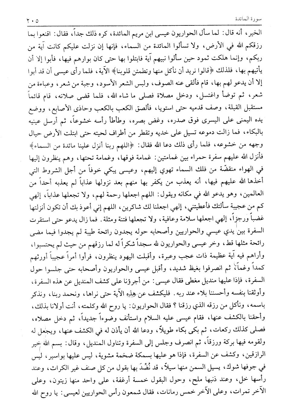 الْخَيْرِ، أَنَّهُ قَالَ: لَمَّا سَأَلَ الْحَوَارِيُّونَ عِيسَى ابن مريم المائدة، كره ذلك جدا، فقال: اقْنَعُوا بِمَا رَزَقَكُمُ اللَّهُ فِي الْأَرْضِ، وَلَا تَسْأَلُوا الْمَائِدَةَ مِنَ السَّمَاءِ، فَإِنَّهَا إِنْ نَزَلَتْ عَلَيْكُمْ كَانَتْ آيَةً مِنْ رَبِّكُمْ، وَإِنَّمَا هَلَكَتْ ثَمُودُ حِينَ سَأَلُوا نَبِيَّهُمْ آيَةً فَابْتُلُوا بِهَا حَتَّى كَانَ بَوَارُهُمْ فِيهَا، فَأَبَوْا إِلَّا أَنْ يَأْتِيَهُمْ بِهَا، فَلِذَلِكَ قالُوا نُرِيدُ أَنْ نَأْكُلَ مِنْها وَتَطْمَئِنَّ قُلُوبُنا الْآيَةَ، فِلْمًا رَأَى عِيسَى أَنْ قَدْ أَبَوْا إِلَّا أَنْ يَدْعُوَ لَهُمْ بِهَا، قَامَ فَأَلْقَى عَنْهُ الصُّوفَ، وَلَبِسَ الشَّعْرَ الْأَسْوَدَ، وَجُبَّةً مِنْ شَعْرٍ، وَعَبَاءَةً مِنْ شَعْرٍ، ثُمَّ تَوَضَّأَ وَاغْتَسَلَ، وَدَخَلَ مُصَلَّاهُ فَصَلَّى مَا شَاءَ اللَّهُ، فَلَمَّا قَضَى صَلَاتَهُ، قَامَ قَائِمًا مُسْتَقْبِلَ الْقِبْلَةَ، وَصَفَّ قَدَمَيْهِ حَتَّى اسْتَوَيَا، فَأَلْصَقَ الْكَعْبَ بِالْكَعْبِ وَحَاذَى الْأَصَابِعَ، وَوَضَعَ يَدَهُ الْيُمْنَى عَلَى الْيُسْرَى فَوْقَ صَدْرِهِ، وَغَضَّ بَصَرَهُ، وَطَأْطَأَ رَأْسَهُ خُشُوعًا، ثُمَّ أَرْسَلَ عَيْنَيْهِ بِالْبُكَاءِ، فَمَا زَالَتْ دُمُوعُهُ تَسِيلُ عَلَى خَدَّيْهِ وَتَقْطُرُ مِنْ أَطْرَافِ لِحْيَتِهِ حَتَّى ابْتَلَّتِ الْأَرْضُ حِيَالَ وَجْهِهِ مِنْ خُشُوعِهِ، فَلَمَّا رَأَى ذَلِكَ دَعَا اللَّهَ فَقَالَ: اللَّهُمَّ رَبَّنا أَنْزِلْ عَلَيْنا مائِدَةً مِنَ السَّماءِ فَأَنْزَلَ اللَّهُ عَلَيْهِمْ سُفْرَةً حَمْرَاءَ بَيْنَ غَمَامَتَيْنِ: غَمَامَةٌ فَوْقَهَا، وَغَمَامَةٌ تَحْتَهَا، وَهُمْ يَنْظُرُونَ إِلَيْهَا فِي الْهَوَاءِ مُنْقَضَّةً مِنْ فَلَكِ السَّمَاءِ تهوي إليهم، وعيسى يبكي خوفا من أجل الشروط التي أخذها اللَّهُ عَلَيْهِمْ فِيهَا، أَنَّهُ يُعَذِّبُ مَنْ يَكْفُرُ بِهَا مِنْهُمْ بَعْدَ نُزُولِهَا عَذَابًا لَمْ يُعَذِّبْهُ أحدا من العالمين، وهو يدعو الله في مكانه ويقول: اللهم اجعلها رحمة لهم، ولا تَجْعَلْهَا عَذَابًا، إِلَهِي كَمْ مِنْ عَجِيبَةٍ سَأَلْتُكَ فأعطيتني، إلهي اجعلنا لك شاكرين، اللهم إني أعوذ بك أن تكون أنزلتها غضبا ورجزا، إِلَهِي اجْعَلْهَا سَلَامَةً وَعَافِيَةً، وَلَا تَجْعَلْهَا فِتْنَةً وَمُثْلَةً. فَمَا زَالَ يَدْعُو حَتَّى اسْتَقَرَّتِ السُّفْرَةُ بَيْنَ يَدَيْ عِيسَى وَالْحَوَارِيِّينَ وَأَصْحَابُهُ حَوْلَهُ يَجِدُونَ رَائِحَةً طَيِّبَةً لَمْ يَجِدُوا فِيمَا مَضَى رَائِحَةً مِثْلَهَا قَطُّ، وَخَرَّ عِيسَى وَالْحَوَارِيُّونَ لِلَّهِ سُجَّدًا شكرا له لما رَزَقَهُمْ مِنْ حَيْثُ لَمْ يَحْتَسِبُوا، وَأَرَاهُمْ فِيهِ آيَةً عَظِيمَةً ذَاتَ عَجَبٍ وَعِبْرَةٍ، وَأَقْبَلَتِ الْيَهُودُ يَنْظُرُونَ، فَرَأَوْا أَمْرًا عَجِيبًا أَوْرَثَهُمْ كَمَدًا وَغَمًّا، ثُمَّ انْصَرَفُوا بِغَيْظٍ شَدِيدٍ، وَأَقْبَلَ عِيسَى وَالْحَوَارِيُّونَ وَأَصْحَابُهُ حَتَّى جَلَسُوا حَوْلَ السُّفْرَةِ، فَإِذَا عَلَيْهَا منديل مغطى فقال عِيسَى: مَنْ أَجْرَؤُنَا عَلَى كَشْفِ الْمِنْدِيلِ عَنْ هَذِهِ السُّفْرَةِ، وَأَوْثَقُنَا بِنَفْسِهِ وَأَحْسَنُنَا بَلَاءً عِنْدَ رَبِّهِ. فَلْيَكْشِفْ عَنْ هَذِهِ الْآيَةِ حَتَّى نَرَاهَا، وَنَحْمَدَ رَبَّنَا، وَنُذَكِّرَ بِاسْمِهِ، وَنَأْكُلَ مِنْ رِزْقِهِ الَّذِي رَزَقَنَا؟ فَقَالَ الْحَوَارِيُّونَ: يَا رُوحَ اللَّهِ وَكَلِمَتَهُ، أَنْتَ أَوْلَانَا بِذَلِكَ، وَأَحَقُّنَا بِالْكَشْفِ عَنْهَا، فَقَامَ عِيسَى عَلَيْهِ السَّلَامُ وَاسْتَأْنَفَ وُضُوءًا جَدِيدًا، ثُمَّ دَخَلَ مُصَلَّاهُ، فَصَلَّى كَذَلِكَ رَكَعَاتٍ، ثُمَّ بَكَى بُكَاءً طَوِيلًا، وَدَعَا اللَّهُ أَنْ يَأْذَنَ لَهُ فِي ال