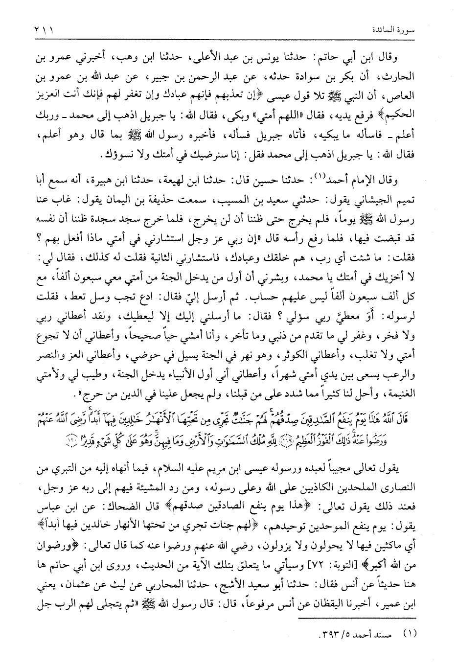 وَقَالَ ابْنُ أَبِي حَاتِمٍ: حَدَّثَنَا يُونُسُ بْنُ عَبْدِ الْأَعْلَى، حَدَّثَنَا ابْنُ وَهْبٍ، أَخْبَرَنِي عَمْرُو بْنُ الْحَارِثِ، أَنَّ بَكْرَ بْنَ سَوَادَةَ حَدَّثَهُ، عَنْ عَبْدِ الرَّحْمَنِ بْنِ جُبَيْرٍ، عَنْ عَبْدِ اللَّهِ بْنِ عَمْرِو بْنِ الْعَاصِ، أن النبي صَلَّى اللَّهُ عَلَيْهِ وَسَلَّمَ تَلَا قَوْلَ عِيسَى إِنْ تُعَذِّبْهُمْ فَإِنَّهُمْ عِبادُكَ وَإِنْ تَغْفِرْ لَهُمْ فَإِنَّكَ أَنْتَ الْعَزِيزُ الْحَكِيمُ فَرَفَعَ يَدَيْهِ، فَقَالَ «اللَّهُمَّ أُمَّتِي» وَبَكَى، فَقَالَ اللَّهُ: يَا جِبْرِيلُ اذْهَبْ إِلَى مُحَمَّدٍ- وَرَبُّكَ أَعْلَمُ- فَاسْأَلْهُ مَا يُبْكِيهِ، فَأَتَاهُ جِبْرِيلُ فَسَأَلَهُ، فَأَخْبَرَهُ رَسُولُ اللَّهِ صَلَّى اللَّهُ عَلَيْهِ وَسَلَّمَ بِمَا قال وهو أعلم، فَقَالَ اللَّهُ: يَا جِبْرِيلُ اذْهَبْ إِلَى مُحَمَّدٍ فَقُلْ: إِنَّا سَنُرْضِيكَ فِي أُمَّتِكَ وَلَا نَسُوؤُكَ.
