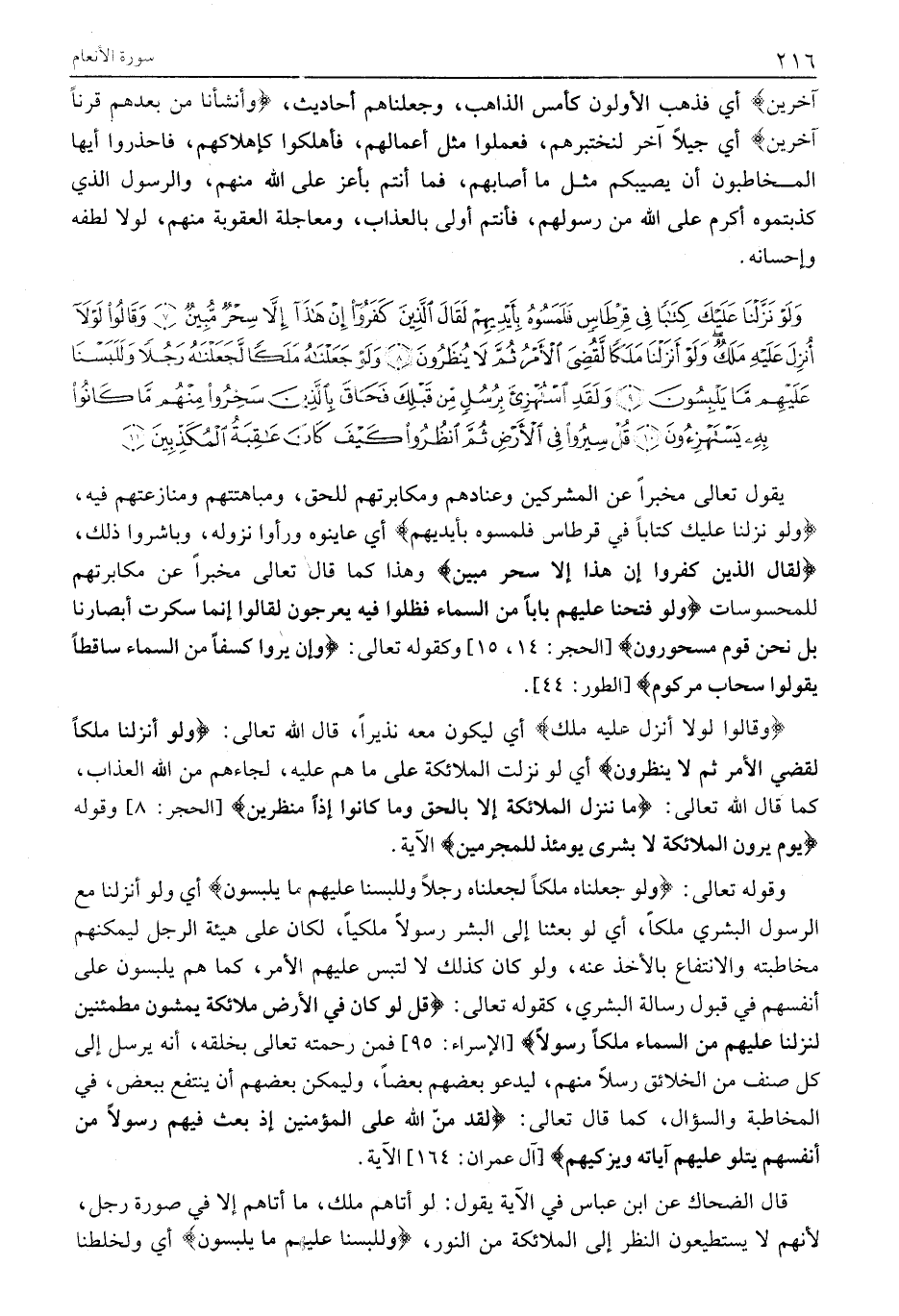 وَلَوْ نَزَّلْنا عَلَيْكَ كِتاباً فِي قِرْطاسٍ فَلَمَسُوهُ بِأَيْدِيهِمْ لَقالَ الَّذِينَ كَفَرُوا إِنْ هَذَا إِلاَّ سِحْرٌ مُبِينٌ (7) وَقالُوا لَوْلا أُنْزِلَ عَلَيْهِ مَلَكٌ وَلَوْ أَنْزَلْنا مَلَكاً لَقُضِيَ الْأَمْرُ ثُمَّ لَا يُنْظَرُونَ (8) وَلَوْ جَعَلْناهُ مَلَكاً لَجَعَلْناهُ رَجُلاً وَلَلَبَسْنا عَلَيْهِمْ مَا يَلْبِسُونَ (9) وَلَقَدِ اسْتُهْزِئَ بِرُسُلٍ مِنْ قَبْلِكَ فَحاقَ بِالَّذِينَ سَخِرُوا مِنْهُمْ مَا كانُوا بِهِ يَسْتَهْزِؤُنَ (10) قُلْ سِيرُوا فِي الْأَرْضِ ثُمَّ انْظُرُوا كَيْفَ كانَ عاقِبَةُ الْمُكَذِّبِينَ (11)