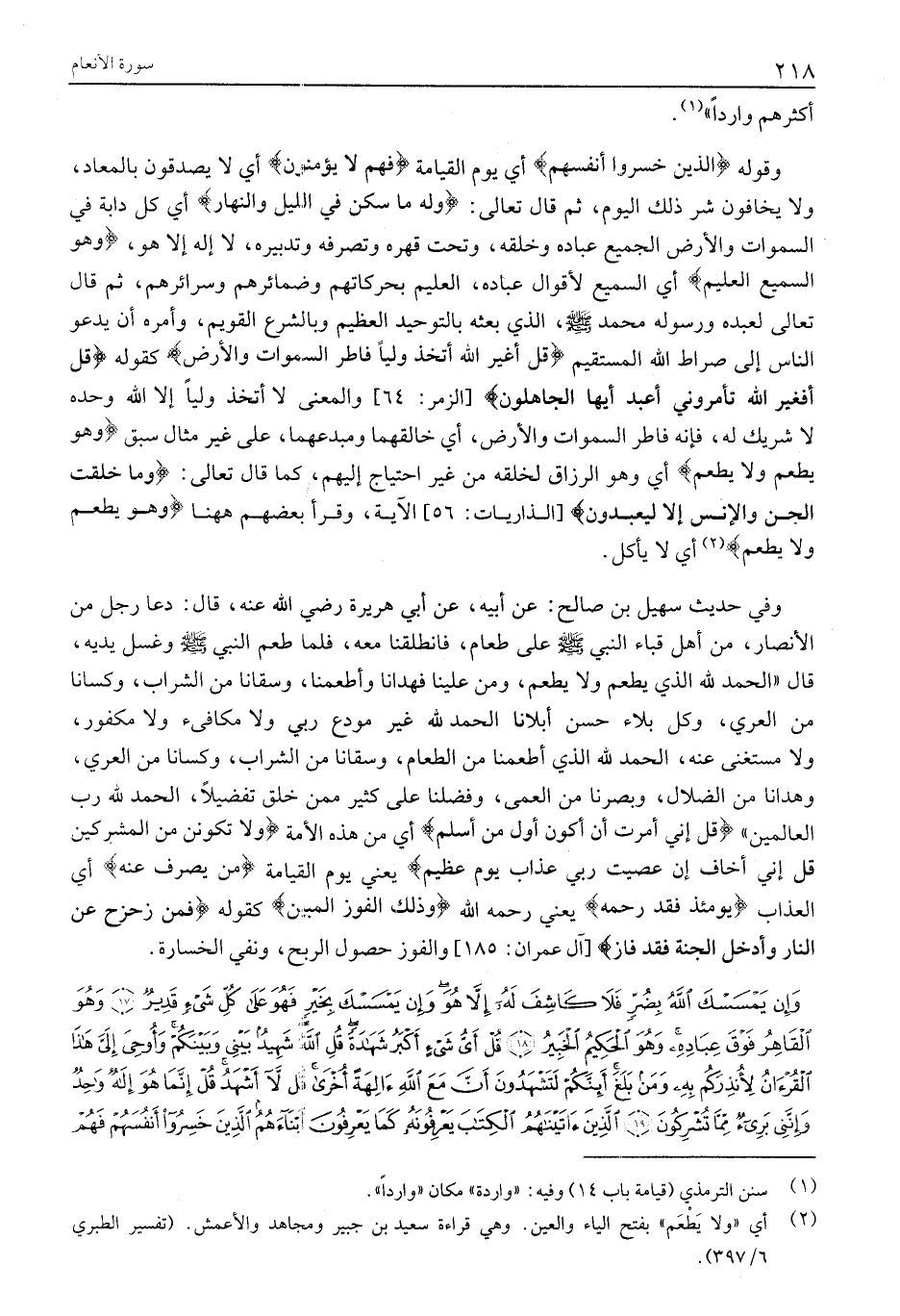 وَفِي حَدِيثِ سُهَيْلِ بْنِ صَالِحٍ: عَنْ أَبِيهِ، عَنْ أَبِي هُرَيْرَةَ رَضِيَ اللَّهُ عَنْهُ، قَالَ: دَعَا رَجُلٌ مِنَ الْأَنْصَارِ، مِنْ أَهْلِ قُبَاءٍ النَّبِيَّ صَلَّى اللَّهُ عَلَيْهِ وسلّم على طعام، فَانْطَلَقْنَا مَعَهُ، فَلَمَّا طَعِمَ النَّبِيُّ صَلَّى اللَّهُ عَلَيْهِ وَسَلَّمَ وَغَسَلَ يَدَيْهِ، قَالَ «الْحَمْدُ لِلَّهِ الَّذِي يُطْعِمُ وَلَا يَطْعَمُ، وَمَنَّ عَلَيْنَا فَهَدَانَا وأطعمنا، وسقانا من الشراب، وكسانا من العري، وَكُلَّ بَلَاءٍ حَسَنٍ أَبَلَانَا الْحَمْدُ لِلَّهِ غَيْرِ مودع ربي ولا مكافئ وَلَا مَكْفُورٍ، وَلَا مُسْتَغْنًى عَنْهُ، الْحَمْدُ لِلَّهِ الَّذِي أَطْعَمَنَا مِنَ الطَّعَامِ، وَسَقَانَا مِنَ الشَّرَابِ، وَكَسَانَا مِنَ الْعُرْيِ، وَهَدَانَا مِنَ الضَّلَالِ، وَبَصَّرَنَا مِنَ الْعَمَى، وَفَضَّلَنَا عَلَى كَثِيرٍ مِمَّنْ خَلَقَ تَفْضِيلًا، الْحَمْدُ لِلَّهِ رَبِّ الْعَالَمِينَ» قُلْ إِنِّي أُمِرْتُ أَنْ أَكُونَ أَوَّلَ مَنْ أَسْلَمَ أَيْ من هذه الأمة وَلا تَكُونَنَّ مِنَ الْمُشْرِكِينَ قُلْ إِنِّي أَخافُ إِنْ عَصَيْتُ رَبِّي عَذابَ يَوْمٍ عَظِيمٍ يَعْنِي يوم القيامة مَنْ يُصْرَفْ عَنْهُ أي العذاب يَوْمَئِذٍ فَقَدْ رَحِمَهُ يعني رحمه الله وَذلِكَ الْفَوْزُ الْمُبِينُ كَقَوْلِهِ فَمَنْ زُحْزِحَ عَنِ النَّارِ وَأُدْخِلَ الْجَنَّةَ فَقَدْ فازَ [آل عمران: 185] والفوز حصول الربح، ونفي الخسارة.