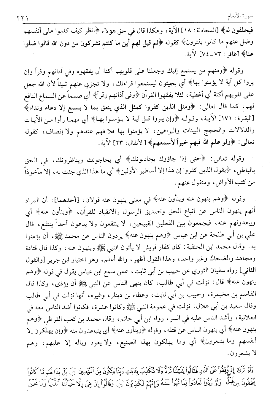 وَقَوْلُهُ وَهُمْ يَنْهَوْنَ عَنْهُ وَيَنْأَوْنَ عَنْهُ في مَعْنَى يَنْهَوْنَ عَنْهُ قَوْلَانِ، [أَحَدُهُمَا] : أَنَّ الْمُرَادَ أَنَّهُمْ يَنْهَوْنَ النَّاسَ عَنِ اتِّبَاعِ الْحَقِّ وَتَصْدِيقِ الرسول والانقياد للقرآن، وَيَنْأَوْنَ عَنْهُ أي ويبعدونهم عَنْهُ، فَيَجْمَعُونَ بَيْنَ الْفِعْلَيْنِ الْقَبِيحَيْنِ، لَا يَنْتَفِعُونَ ولا يدعون أحدا ينتفع، قَالَ عَلِيُّ بْنُ أَبِي طَلْحَةَ عَنِ ابْنِ عباس وَهُمْ يَنْهَوْنَ عَنْهُ يردون النَّاسَ عَنْ مُحَمَّدٍ صَلَّى اللَّهُ عَلَيْهِ وَسَلَّمَ، أن يؤمنوا به. وقال محمد ابن الْحَنَفِيَّةِ: كَانَ كَفَّارُ قُرَيْشٍ لَا يَأْتُونَ النَّبِيَّ صَلَّى اللَّهُ عَلَيْهِ وَسَلَّمَ وَيَنْهَوْنَ عَنْهُ، وَكَذَا قال قتادة ومجاهد وَالضَّحَّاكُ وَغَيْرُ وَاحِدٍ، وَهَذَا الْقَوْلُ أَظْهَرُ، وَاللَّهُ أَعْلَمُ، وَهُوَ اخْتِيَارُ ابْنِ جَرِيرٍ [وَالْقَوْلُ الثَّانِي] رَوَاهُ سُفْيَانُ الثَّوْرِيُّ عَنْ حَبِيبِ بْنِ أَبِي ثَابِتٍ، عَمَّنْ سَمِعَ ابْنَ عَبَّاسٍ يَقُولُ فِي قَوْلِهِ وَهُمْ يَنْهَوْنَ عَنْهُ قَالَ: نَزَلَتْ فِي أَبِي طَالِبٍ، كَانَ يَنْهَى النَّاسَ عَنِ النَّبِيِّ صَلَّى اللَّهُ عَلَيْهِ وَسَلَّمَ أَنْ يُؤْذَى، وَكَذَا قَالَ الْقَاسِمُ بْنُ مُخَيْمِرَةَ، وَحَبِيبُ بْنُ أَبِي ثابت، وعطاء بن دينار، وغيره، إِنَّهَا نَزَلَتْ فِي أَبِي طَالِبٍ وَقَالَ سَعِيدُ بْنُ أَبِي هِلَالٍ: نَزَلَتْ فِي عُمُومَةِ النَّبِيِّ صَلَّى اللَّهُ عَلَيْهِ وَسَلَّمَ وَكَانُوا عَشَرَةً، فَكَانُوا أَشَدَّ النَّاسِ مَعَهُ فِي الْعَلَانِيَةِ، وَأَشَدَّ النَّاسِ عَلَيْهِ فِي السِّرِّ، رَوَاهُ ابْنُ أَبِي حَاتِمٍ، وَقَالَ مُحَمَّدُ بْنُ كَعْبٍ الْقُرَظِيُّ وَهُمْ يَنْهَوْنَ عَنْهُ أي ينهون الناس عن قتله، وقوله وَيَنْأَوْنَ عَنْهُ أَيْ يَتَبَاعَدُونَ مِنْهُ وَإِنْ يُهْلِكُونَ إِلَّا أَنْفُسَهُمْ وَما يَشْعُرُونَ أَيْ وَمَا يُهْلِكُونَ بِهَذَا الصَّنِيعِ، وَلَا يَعُودُ وَبَالُهُ إِلَّا عَلَيْهِمْ، وهم لا يشعرون.