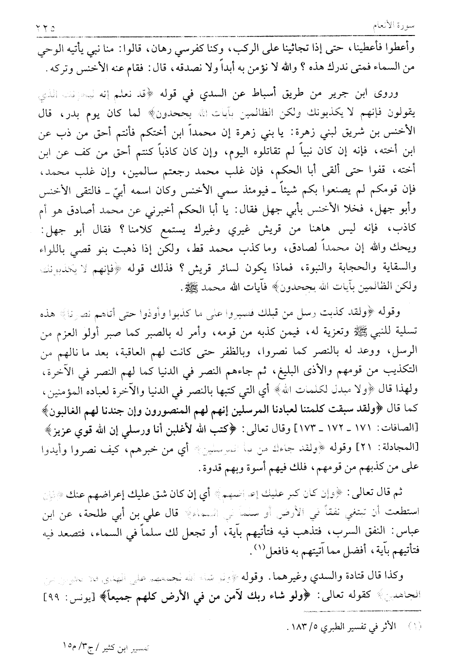 وَرَوَى ابْنُ جَرِيرٍ مِنْ طَرِيقِ أَسْبَاطٍ عَنِ السُّدِّيِّ فِي قَوْلِهِ قَدْ نَعْلَمُ إِنَّهُ لَيَحْزُنُكَ الَّذِي يَقُولُونَ فَإِنَّهُمْ لَا يُكَذِّبُونَكَ وَلكِنَّ الظَّالِمِينَ بِآياتِ اللَّهِ يَجْحَدُونَ لَمَّا كَانَ يَوْمُ بَدْرٍ، قَالَ الْأَخْنَسُ بْنُ شُرَيْقٍ لِبَنِي زُهْرَةَ: يَا بَنِي زُهْرَةَ إِنَّ محمدا ابن أختكم فأنتم أحق من ذب عن ابن أخته، فَإِنَّهُ إِنْ كَانَ نَبِيًّا لَمْ تُقَاتِلُوهُ الْيَوْمَ، وَإِنْ كَانَ كَاذِبًا كُنْتُمْ أَحَقَّ مَنْ كَفَّ عن ابن أخته، قفوا حَتَّى أَلْقَى أَبَا الْحَكَمِ، فَإِنْ غُلِبَ مُحَمَّدٌ رَجَعْتُمْ سَالِمِينَ، وَإِنْ غَلَبَ مُحَمَّدٌ، فَإِنَّ قَوْمَكُمْ لَمْ يَصْنَعُوا بِكُمْ شَيْئًا- فَيَوْمَئِذٍ سُمِّيَ الْأَخْنَسُ وَكَانَ اسْمَهُ أُبَيٌّ- فَالْتَقَى الْأَخْنَسُ وَأَبُو جَهْلٍ، فَخَلَا الْأَخْنَسُ بِأَبِي جَهْلٍ فَقَالَ: يَا أَبَا الْحَكَمِ أَخْبِرْنِي عَنْ مُحَمَّدٍ أُصَادِقٌ هُوَ أَمْ كَاذِبٌ، فَإِنَّهُ لَيْسَ هَاهُنَا مِنْ قُرَيْشٍ غَيْرِي وغيرك يستمع كَلَامَنَا؟ فَقَالَ أَبُو جَهْلٍ: