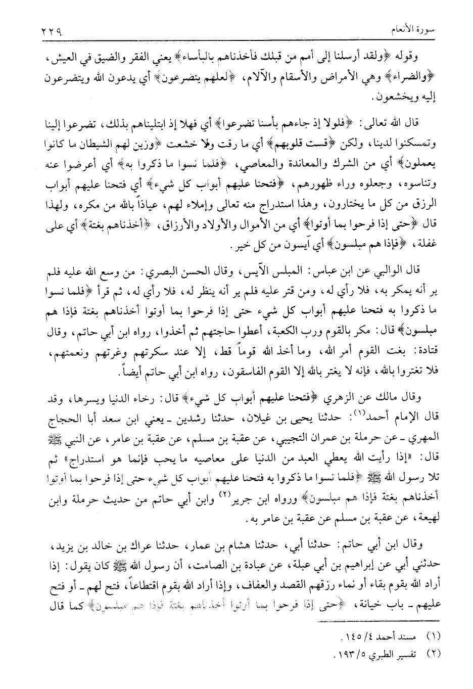 وَقَالَ مَالِكٌ عَنِ الزُّهْرِيِّ فَتَحْنا عَلَيْهِمْ أَبْوابَ كُلِّ شَيْءٍ قَالَ: رخاء الدنيا ويسرها، وَقَدْ قَالَ الْإِمَامُ أَحْمَدُ «1» : حَدَّثَنَا يَحْيَى بْنُ غَيْلَانَ، حَدَّثَنَا رِشْدِينَ- يَعْنِي ابْنَ سَعْدٍ أَبَا الْحَجَّاجِ الْمَهْرِيَّ- عَنْ حَرْمَلَةَ بْنِ عِمْرَانَ التُّجِيبِيِّ، عَنْ عُقْبَةَ بْنِ مُسْلِمٍ، عَنْ عُقْبَةَ بْنِ عَامِرٍ، عَنِ النَّبِيِّ صَلَّى اللَّهُ عَلَيْهِ وَسَلَّمَ قَالَ: «إِذَا رَأَيْتَ اللَّهَ يُعْطِي الْعَبْدَ مِنَ الدُّنْيَا عَلَى مَعَاصِيهِ مَا يُحِبُّ فَإِنَّمَا هُوَ اسْتِدْرَاجٌ» ثُمَّ تَلَا رَسُولُ اللَّهِ صَلَّى اللَّهُ عَلَيْهِ وَسَلَّمَ فَلَمَّا نَسُوا مَا ذُكِّرُوا بِهِ فَتَحْنا عَلَيْهِمْ أَبْوابَ كُلِّ شَيْءٍ حَتَّى إِذا فَرِحُوا بِما أُوتُوا أَخَذْناهُمْ بَغْتَةً فَإِذا هُمْ مُبْلِسُونَ وَرَوَاهُ ابْنُ جَرِيرٍ «2» وَابْنُ أَبِي حَاتِمٍ مِنْ حَدِيثِ حَرْمَلَةَ وَابْنِ لَهِيعَةَ، عَنْ عُقْبَةَ بْنِ مُسْلِمٍ عَنْ عُقْبَةَ بْنِ عَامِرٍ بِهِ.