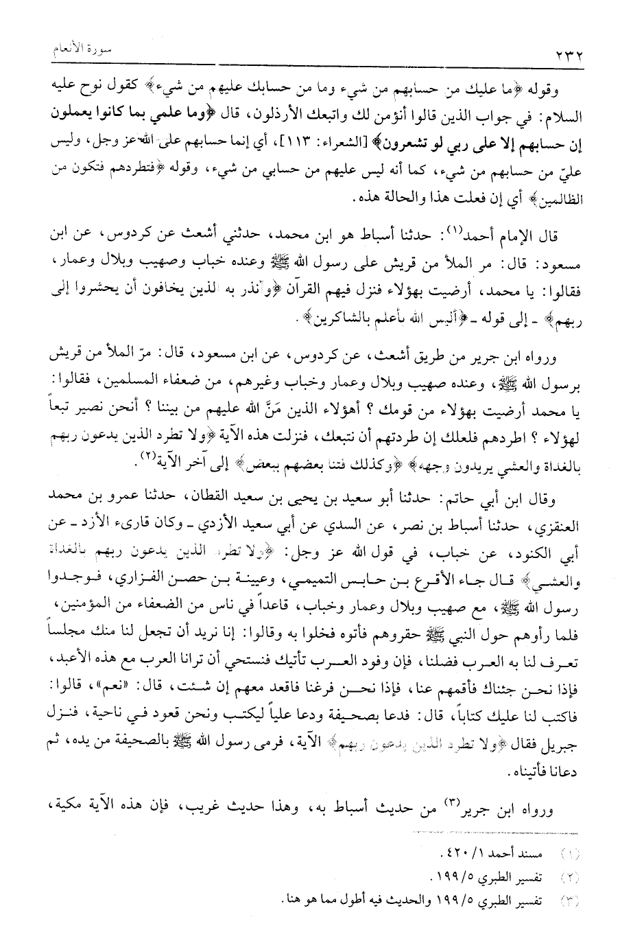 يَا مُحَمَّدُ أَرَضِيتَ بِهَؤُلَاءِ مِنْ قَوْمِكَ؟ أَهَؤُلَاءِ الذين منّ الله عليهم من بيننا؟ أنحن نصير تبعا لهؤلاء؟ اطردهم فَلَعَلَّكَ إِنْ طَرَدْتَهُمْ أَنْ نَتَّبِعَكَ، فَنَزَلَتْ هَذِهِ الْآيَةُ وَلا تَطْرُدِ الَّذِينَ يَدْعُونَ رَبَّهُمْ بِالْغَداةِ وَالْعَشِيِّ يُرِيدُونَ وَجْهَهُ وَكَذلِكَ فَتَنَّا بَعْضَهُمْ بِبَعْضٍ إِلَى آخِرِ الْآيَةِ «2» .