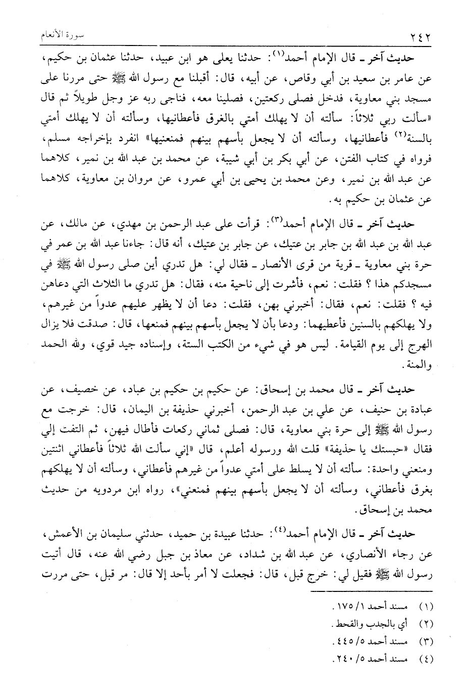 حَدِيثٌ آخَرُ- قَالَ الْإِمَامُ أَحْمَدُ «1» : حَدَّثَنَا يَعْلَى هُوَ ابْنُ عُبَيْدٍ، حَدَّثَنَا عُثْمَانُ بْنُ حَكِيمٍ، عن عامر بن سعيد بْنِ أَبِي وَقَّاصٍ، عَنْ أَبِيهِ، قَالَ: أَقْبَلْنَا مَعَ رَسُولِ اللَّهِ صَلَّى اللَّهُ عَلَيْهِ وَسَلَّمَ حَتَّى مَرَرْنَا عَلَى مَسْجِدِ بَنِي مُعَاوِيَةَ، فَدَخَلَ فَصَلَّى رَكْعَتَيْنِ، فَصَلَّيْنَا مَعَهُ، فَنَاجَى رَبَّهُ عَزَّ وجل طويلا ثم قال «سألت ربي ثلاثا: سألته أن لا يهلك أمتي بالغرق فأعطانيها، وسألته أن لا يهلك أمتي بالسنة «2» فأعطانيها، وسألته أن لا يَجْعَلَ بَأْسَهُمْ بَيْنَهُمْ فَمَنَعَنِيهَا» انْفَرَدَ بِإِخْرَاجِهِ مُسْلِمٌ، فَرَوَاهُ فِي كِتَابِ الْفِتَنِ، عَنْ أَبِي بَكْرِ بْنِ أَبِي شَيْبَةَ، عَنْ مُحَمَّدِ بْنِ عَبْدِ اللَّهِ بْنِ نُمَيْرٍ، كِلَاهُمَا عَنْ عَبْدِ اللَّهِ بْنِ نُمَيْرٍ، وَعَنْ محمد بن يحيى بن أبي عمرو، عَنْ مَرْوَانَ بْنِ مُعَاوِيَةَ، كِلَاهُمَا عَنْ عُثْمَانَ بْنِ حَكِيمٍ بِهِ.