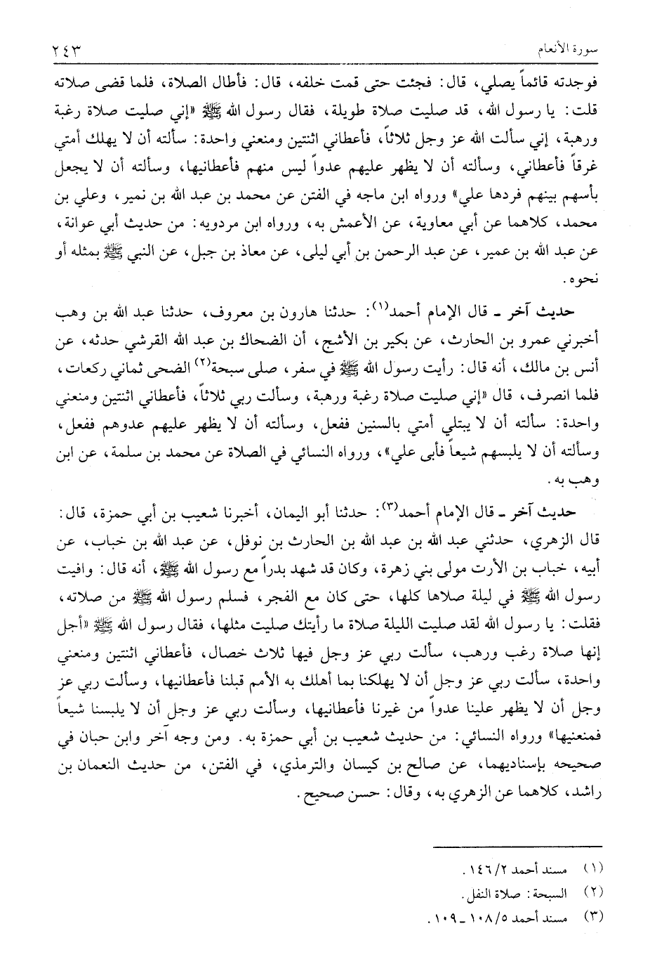 حَدِيثٌ آخَرُ- قَالَ الْإِمَامُ أَحْمَدُ «1» : حَدَّثَنَا هَارُونُ بْنُ مَعْرُوفٍ، حَدَّثَنَا عَبْدُ اللَّهِ بْنُ وَهْبٍ أَخْبَرَنِي عَمْرُو بْنُ الْحَارِثِ، عَنْ بُكَيْرِ بْنِ الْأَشَجِّ، أَنَّ الضَّحَّاكَ بْنَ عَبْدِ اللَّهِ الْقُرَشِيَّ حَدَّثَهُ، عَنْ أَنَسِ بْنِ مَالِكٍ، أَنَّهُ قَالَ: رَأَيْتُ رَسُولَ اللَّهِ صَلَّى اللَّهُ عَلَيْهِ وَسَلَّمَ فِي سَفَرٍ، صَلَّى سُبْحَةَ «2» الضُّحَى ثَمَانِيَ رَكَعَاتٍ، فَلَمَّا انْصَرَفَ، قَالَ «إِنِّي صَلَّيْتُ صلاة رغبة ورهبة، وسألت رَبِّي ثَلَاثًا، فَأَعْطَانِي اثْنَتَيْنِ وَمَنَعَنِي وَاحِدَةً: سَأَلْتُهُ أن لا يبتلي أمتي بالسنين ففعل، وسألته أن لا يظهر عليهم عدوهم ففعل، وسألته أن لا يلبسهم شيعا فأبى علي» ، ورواه النَّسَائِيُّ فِي الصَّلَاةِ عَنْ مُحَمَّدِ بْنِ سَلَمَةَ، عَنِ ابْنِ وَهْبٍ بِهِ.
