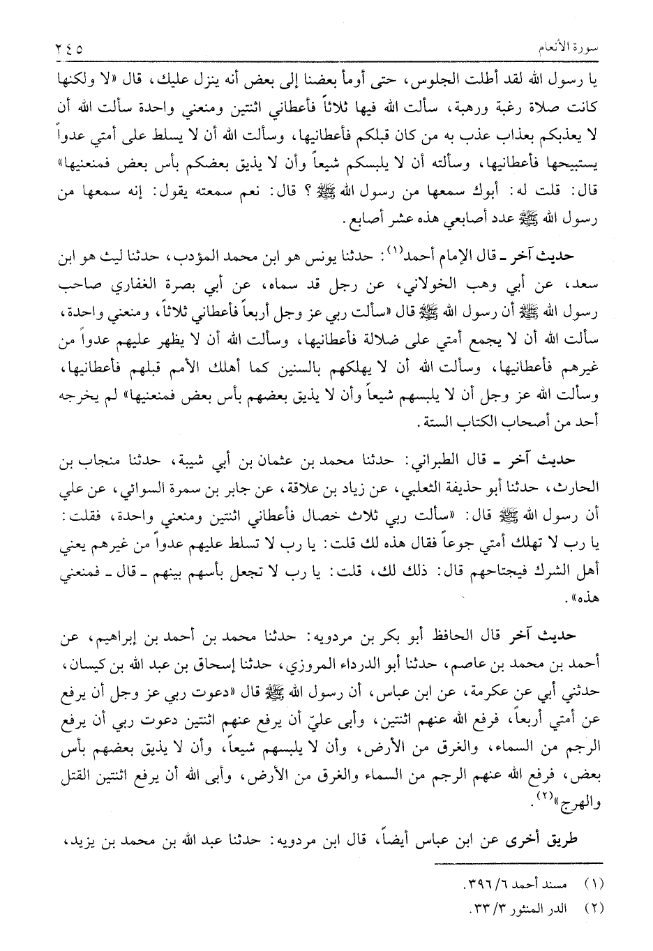 حَدِيثٌ آخَرُ قَالَ الْحَافِظُ أَبُو بَكْرِ بْنُ مَرْدَوَيْهِ: حَدَّثَنَا مُحَمَّدُ بْنُ أَحْمَدَ بْنِ إِبْرَاهِيمَ، عَنْ أَحْمَدَ بْنِ مُحَمَّدِ بْنِ عَاصِمٍ، حَدَّثَنَا أَبُو الدَّرْدَاءِ الْمَرْوَزِيُّ، حَدَّثَنَا إِسْحَاقُ بْنُ عَبْدِ اللَّهِ بْنِ كَيْسَانَ، حَدَّثَنِي أَبِي عَنْ عِكْرِمَةَ، عَنِ ابْنِ عَبَّاسٍ، أَنَّ رَسُولَ اللَّهِ صَلَّى الله عليه وَسَلَّمَ قَالَ «دَعَوْتُ رَبِّي عَزَّ وَجَلَّ أَنْ يَرْفَعَ عَنْ أُمَّتِي أَرْبَعًا، فَرَفَعَ اللَّهُ عَنْهُمُ اثْنَتَيْنِ، وَأَبَى عَلَيَّ أَنْ يَرْفَعَ عَنْهُمُ اثْنَتَيْنِ دَعَوْتُ رَبِّي أَنْ يَرْفَعَ الرَّجْمَ مِنَ السَّمَاءِ، والغرق من الأرض، وأن لا يلبسهم شيعا، وأن لا يُذِيقَ بَعْضَهُمْ بَأْسَ بَعْضٍ، فَرَفَعَ اللَّهُ عَنْهُمُ الرَّجْمَ مِنَ السَّمَاءِ وَالْغَرَقَ مِنَ الْأَرْضِ، وَأَبَى اللَّهُ أَنْ يَرْفَعَ اثْنَتَيْنِ الْقَتْلَ وَالْهَرْجَ» «2» .