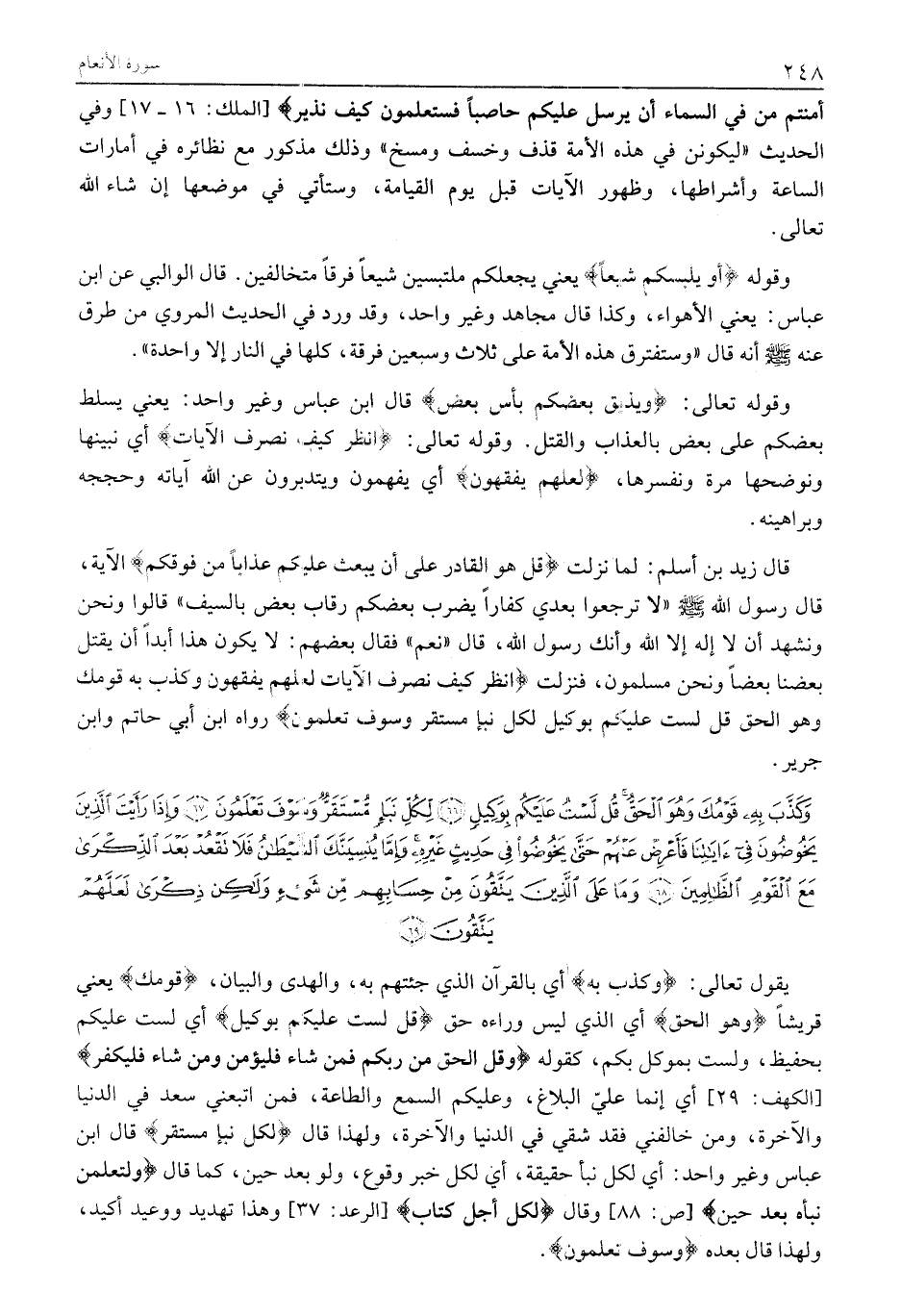 قَالَ زَيْدُ بْنُ أَسْلَمَ: لَمَّا نَزَلَتْ قُلْ هُوَ الْقادِرُ عَلى أَنْ يَبْعَثَ عَلَيْكُمْ عَذاباً مِنْ فَوْقِكُمْ الْآيَةَ، قَالَ رَسُولُ اللَّهِ صَلَّى اللَّهُ عَلَيْهِ وَسَلَّمَ «لَا تَرْجِعُوا بَعْدِي كُفَّارًا يَضْرِبُ بَعْضُكُمْ رقاب بعض بالسيف» قالوا ونحن ونشهد أَنْ لَا إِلَهَ إِلَّا اللَّهُ وَأَنَّكَ رَسُولُ الله، قال «نعم» فقال بعضهم: لَا يَكُونُ هَذَا أَبَدًا أَنْ يَقْتُلَ بَعْضُنَا بَعْضًا وَنَحْنُ مُسْلِمُونَ، فَنَزَلَتْ انْظُرْ كَيْفَ نُصَرِّفُ الْآياتِ لَعَلَّهُمْ يَفْقَهُونَ وَكَذَّبَ بِهِ قَوْمُكَ وَهُوَ الْحَقُّ قُلْ لَسْتُ عَلَيْكُمْ بِوَكِيلٍ لِكُلِّ نَبَإٍ مُسْتَقَرٌّ وَسَوْفَ تَعْلَمُونَ رَوَاهُ ابْنُ أَبِي حَاتِمٍ وابن جرير.