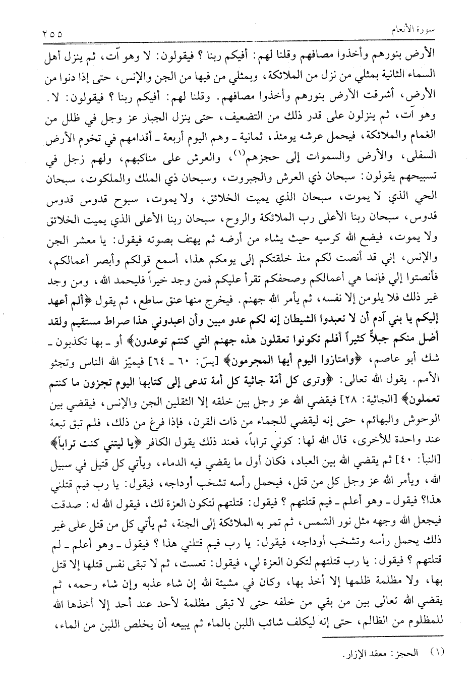 وَهُوَ آتٍ، ثُمَّ يَنْزِلُونَ عَلَى قَدْرِ ذَلِكَ مِنَ التَّضْعِيفِ، حَتَّى يَنْزِلَ الْجَبَّارُ عَزَّ وَجَلَّ فِي ظُلَلٍ مِنَ الْغَمَامِ وَالْمَلَائِكَةِ، فَيَحْمِلُ عَرْشَهُ يَوْمئِذٍ، ثَمَانِيَةٌ- وَهُمُ الْيَوْمَ أَرْبَعَةٌ- أَقْدَامُهُمْ فِي تُخُومِ الْأَرْضِ السُّفْلَى، وَالْأَرْضُ وَالسَّمَوَاتُ إلى حجزهم «1» ، والعرش على مناكبهم، ولهم زَجَلٌ فِي تَسْبِيحِهِمْ يَقُولُونَ: سُبْحَانَ ذِي الْعَرْشِ والجبروت، وسبحان ذِي الْمُلْكِ وَالْمَلَكُوتِ، سُبْحَانَ الْحَيِّ الذِي لَا يَمُوتُ، سُبْحَانَ الذِي يُمِيتُ الْخَلَائِقَ، وَلَا يَمُوتُ، سُبُّوحٌ قُدُّوسٌ قُدُّوسٌ قُدُّوسٌ، سُبْحَانَ رَبِّنَا الْأَعْلَى رَبِّ الْمَلَائِكَةِ وَالرُّوحِ، سُبْحَانَ رَبِّنَا الْأَعْلَى الَّذِي يُمِيتُ الْخَلَائِقَ وَلَا يَمُوتُ، فَيَضَعُ اللَّهُ كُرْسِيَّهُ حَيْثُ يَشَاءُ مِنْ أَرْضِهِ ثُمَّ يَهْتِفُ بِصَوْتِهِ فيقول: يَا مَعْشَرَ الْجِنِّ وَالْإِنْسِ، إِنِّي قَدْ أَنْصَتُّ لَكُمْ مُنْذُ خَلَقْتُكُمْ إِلَى يَوْمِكُمْ هَذَا، أَسْمَعُ قَوْلَكُمْ وَأُبْصِرُ أَعْمَالَكُمْ، فَأَنْصِتُوا إِلَيَّ فَإِنَّمَا هِيَ أَعْمَالُكُمْ وَصُحُفُكُمْ تُقْرَأُ عَلَيْكُمْ فَمَنْ وَجَدَ خَيْرًا فَلْيَحْمَدِ اللَّهَ، وَمِنْ وَجَدَ غير ذلك فلا يَلُومَنَّ إِلَّا نَفْسَهُ، ثُمَّ يَأْمُرُ اللَّهُ جَهَنَّمَ. فيخرج منها عنق سَاطِعٌ، ثُمَّ يَقُولُ أَلَمْ أَعْهَدْ إِلَيْكُمْ يَا بَنِي آدَمَ أَنْ لَا تَعْبُدُوا الشَّيْطانَ إِنَّهُ لَكُمْ عَدُوٌّ مُبِينٌ وَأَنِ اعْبُدُونِي هَذَا صِراطٌ مُسْتَقِيمٌ وَلَقَدْ أَضَلَّ مِنْكُمْ جِبِلًّا كَثِيراً أَفَلَمْ تَكُونُوا تَعْقِلُونَ هذِهِ جَهَنَّمُ الَّتِي كُنْتُمْ تُوعَدُونَ أَوْ- بِهَا تُكَذِّبُونَ- شَكَّ أَبُو عَاصِمٍ، وَامْتازُوا الْيَوْمَ أَيُّهَا الْمُجْرِمُونَ [يس: 60- 64] فَيُمَيِّزُ اللَّهُ النَّاسَ وَتَجْثُو الْأُمَمُ. يَقُولُ اللَّهُ تَعَالَى: وَتَرى كُلَّ أُمَّةٍ جاثِيَةً كُلُّ أُمَّةٍ تُدْعى إِلى كِتابِهَا الْيَوْمَ تُجْزَوْنَ مَا كُنْتُمْ تَعْمَلُونَ [الْجَاثِيَةِ: 28] فَيَقْضِي اللَّهُ عَزَّ وَجَلَّ بَيْنَ خَلْقِهِ إِلَّا الثَّقَلَيْنِ الجن والإنس، فيقضي بين الوحوش وَالْبَهَائِمِ، حَتَّى إِنَّهُ لَيَقْضِي لِلْجَمَّاءِ مِنْ ذَاتِ الْقَرْنِ، فَإِذَا فَرَغَ مِنْ ذَلِكَ، فَلَمْ تَبْقَ تَبِعَةٌ عِنْدَ وَاحِدَةٍ لِلْأُخْرَى، قَالَ اللَّهُ لَهَا: كوني ترابا، فعند ذلك يقول الكافرا لَيْتَنِي كُنْتُ تُراباً