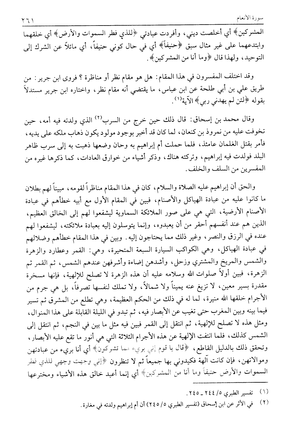 وَالْحَقُّ أَنَّ إِبْرَاهِيمَ عَلَيْهِ الصَّلَاةُ وَالسَّلَامُ، كَانَ فِي هَذَا الْمَقَامِ مُنَاظِرًا لِقَوْمِهِ، مُبَيِّنًا لَهُمْ بُطْلَانَ مَا كَانُوا عَلَيْهِ مِنْ عِبَادَةِ الْهَيَاكِلِ وَالْأَصْنَامِ، فَبَيَّنَ فِي الْمَقَامِ الْأَوَّلِ مَعَ أَبِيهِ خَطَأَهُمْ فِي عِبَادَةِ الْأَصْنَامِ الْأَرْضِيَّةِ، التي هي على صور الْمَلَائِكَةِ السَّمَاوِيَّةِ لِيَشْفَعُوا لَهُمْ إِلَى الْخَالِقِ الْعَظِيمِ، الَّذِينَ هُمْ عِنْدَ أَنْفُسِهِمْ أَحْقَرُ مِنْ أَنْ يَعْبُدُوهُ، وَإِنَّمَا يَتَوَسَّلُونَ إِلَيْهِ بِعِبَادَةِ مَلَائِكَتِهِ، لِيَشْفَعُوا لَهُمْ عِنْدَهُ فِي الرِّزْقِ وَالنَّصْرِ، وَغَيْرِ ذَلِكَ مِمَّا يَحْتَاجُونَ إِلَيْهِ. وَبَيَّنَ فِي هَذَا الْمَقَامِ خَطَأَهُمْ وَضَلَالَهُمْ فِي عِبَادَةِ الْهَيَاكِلِ، وَهِيَ الْكَوَاكِبُ السَّيَّارَةُ السَّبْعَةُ الْمُتَحَيِّرَةُ، وَهِيَ: الْقَمَرُ وَعُطَارِدُ وَالزَّهْرَةُ والشمس والمريخ والمشتري وزحل، وأشدهن إضاءة وأشرفهن عِنْدَهُمُ الشَّمْسُ، ثُمَّ الْقَمَرُ ثُمَّ الزُّهَرَةُ، فَبَيَّنَ أولا صلوات الله وسلامه عليه أن هذه الزهرة لا تصلح للإلهية، فإنها مُسَخَّرَةٌ مَقَدَّرَةٌ بِسَيْرٍ مُعَيَّنٍ، لَا تَزِيغُ عَنْهُ يَمِينًا وَلَا شِمَالًا، وَلَا تَمْلِكُ لِنَفْسِهَا تَصَرُّفًا، بَلْ هِيَ جِرْمٌ مِنَ الْأَجْرَامِ خَلَقَهَا اللَّهُ مُنِيرَةً، لِمَا لَهُ فِي ذَلِكَ مِنَ الْحِكَمِ الْعَظِيمَةِ، وَهِيَ تَطْلُعُ مِنَ الْمَشْرِقِ ثُمَّ تَسِيرُ فِيمَا بَيْنَهُ وَبَيْنَ الْمَغْرِبِ حَتَّى تَغِيبَ عَنِ الْأَبْصَارِ فِيهِ، ثُمَّ تَبْدُو فِي اللَّيْلَةِ الْقَابِلَةِ عَلَى هَذَا الْمِنْوَالِ، وَمِثْلُ هَذِهِ لَا تَصْلُحُ لِلْإِلَهِيَّةِ، ثُمَّ انْتَقَلَ إِلَى الْقَمَرِ فَبَيَّنَ فِيهِ مِثْلَ مَا بَيَّنَ فِي النَّجْمِ، ثُمَّ انْتَقَلَ إِلَى الشَّمْسِ كَذَلِكَ، فَلَمَّا انْتَفَتِ الْإِلَهِيَّةُ عَنْ هَذِهِ الْأَجْرَامِ الثَّلَاثَةِ الَّتِي هِيَ أَنْوَرُ مَا تَقَعُ عَلَيْهِ الْأَبْصَارُ، وَتَحَقَّقَ ذَلِكَ بِالدَّلِيلِ الْقَاطِعِ، قالَ يَا قَوْمِ إِنِّي بَرِيءٌ مِمَّا تُشْرِكُونَ أَيْ أَنَا بَرِيءٌ مِنْ عِبَادَتِهِنَّ وَمُوَالَاتِهِنَّ، فَإِنْ كَانَتْ آلِهَةً فَكِيدُونِي بِهَا جَمِيعًا ثُمَّ لَا تُنْظِرُونَ إِنِّي وَجَّهْتُ وَجْهِيَ لِلَّذِي فَطَرَ السَّماواتِ وَالْأَرْضَ حَنِيفاً وَما أَنَا مِنَ الْمُشْرِكِينَ أَيْ إنما أعبد خالق هذه الأشياء ومخترعها