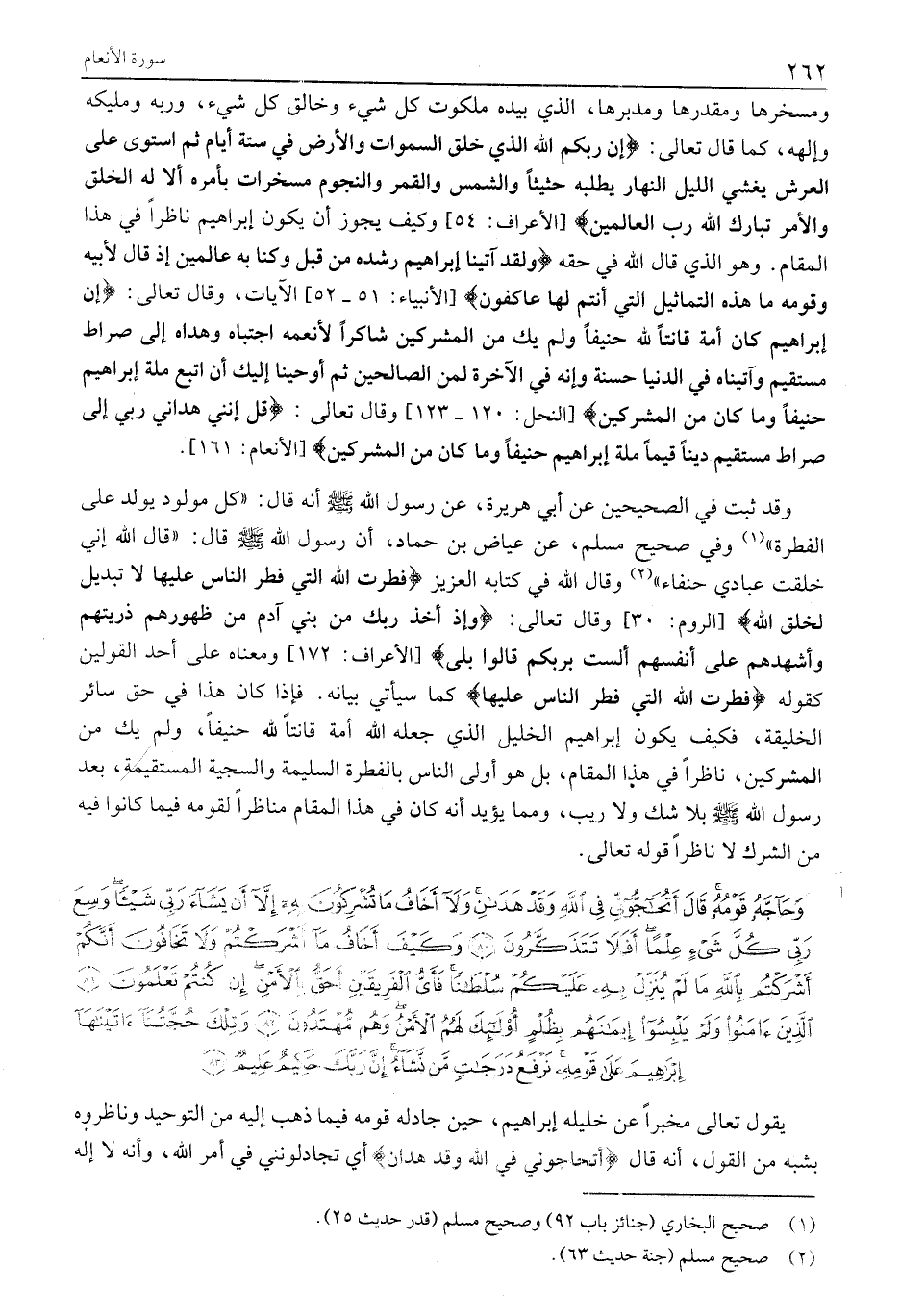 وَقَدْ ثَبَتَ فِي الصَّحِيحَيْنِ عَنْ أَبِي هُرَيْرَةَ، عَنْ رَسُولِ اللَّهِ صَلَّى اللَّهُ عَلَيْهِ وَسَلَّمَ أَنَّهُ قَالَ: «كُلُّ مَوْلُودٍ يُولَدُ عَلَى الْفِطْرَةِ» «1» وَفِي صَحِيحِ مُسْلِمٍ، عَنْ عِيَاضِ بْنِ حَمَّادٍ، أَنَّ رَسُولَ اللَّهِ صَلَّى اللَّهُ عَلَيْهِ وَسَلَّمَ قَالَ: «قَالَ اللَّهُ إِنِّي خَلَقْتُ عِبَادِي حُنَفَاءَ» «2» وَقَالَ اللَّهُ في كتابه العزيز فِطْرَتَ اللَّهِ الَّتِي فَطَرَ النَّاسَ عَلَيْها لَا تَبْدِيلَ لِخَلْقِ اللَّهِ [الرُّومِ: 30] وَقَالَ تَعَالَى: وَإِذْ أَخَذَ رَبُّكَ مِنْ بَنِي آدَمَ مِنْ ظُهُورِهِمْ ذُرِّيَّتَهُمْ وَأَشْهَدَهُمْ عَلى أَنْفُسِهِمْ أَلَسْتُ بِرَبِّكُمْ قالُوا بَلى [الأعراف: 172] ومعناه على أحد القولين كقوله فِطْرَتَ اللَّهِ الَّتِي فَطَرَ النَّاسَ عَلَيْها كَمَا سَيَأْتِي بَيَانُهُ. فَإِذَا كَانَ هَذَا فِي حَقٍّ سَائِرِ الْخَلِيقَةِ، فَكَيْفَ يَكُونُ إِبْرَاهِيمُ الْخَلِيلُ الَّذِي جَعَلَهُ اللَّهُ أُمَّةً قَانِتًا لِلَّهِ حَنِيفًا، وَلَمْ يَكُ مِنَ المشركين، نَاظِرًا فِي هَذَا الْمَقَامِ، بَلْ هُوَ أَوْلَى النَّاسِ بِالْفِطْرَةِ السَّلِيمَةِ وَالسَّجِيَّةِ الْمُسْتَقِيمَةِ، بَعْدَ رَسُولِ اللَّهِ صَلَّى اللَّهُ عَلَيْهِ وَسَلَّمَ بِلَا شَكٍّ وَلَا رَيْبٍ، وَمِمَّا يُؤَيِّدُ أَنَّهُ كَانَ فِي هَذَا الْمَقَامِ مُنَاظِرًا لِقَوْمِهِ فِيمَا كَانُوا فِيهِ من الشرك لا ناظرا قوله تعالى.