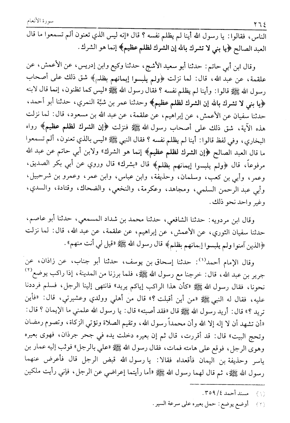 وَقَالَ ابْنُ أَبِي حَاتِمٍ: حَدَّثَنَا أَبُو سَعِيدٍ الْأَشَجُّ، حَدَّثَنَا وَكِيعٌ وابن إدريس، عن الأعمش، عَنْ عَلْقَمَةَ، عَنْ عَبْدِ اللَّهِ، قَالَ: لَمَّا نَزَلَتْ وَلَمْ يَلْبِسُوا إِيمانَهُمْ بِظُلْمٍ شَقَّ ذَلِكَ عَلَى أَصْحَابِ رَسُولِ اللَّهِ صَلَّى اللَّهُ عَلَيْهِ وَسَلَّمَ قَالُوا: وَأَيُّنَا لَمْ يَظْلِمْ نَفْسَهُ؟ فَقَالَ رَسُولُ اللَّهِ صَلَّى اللَّهُ عَلَيْهِ وَسَلَّمَ «لَيْسَ كما تظنون، إنما قال لِابْنِهِ يَا بُنَيَّ لَا تُشْرِكْ بِاللَّهِ إِنَّ الشِّرْكَ لَظُلْمٌ عَظِيمٌ وَحَدَّثَنَا عُمَرُ بْنُ شَبَّةَ النَّمَرِيُّ، حَدَّثَنَا أَبُو أَحْمَدَ، حَدَّثَنَا سُفْيَانُ عَنِ الْأَعْمَشِ، عَنْ إِبْرَاهِيمَ، عَنْ عَلْقَمَةَ، عَنْ عَبْدِ اللَّهِ بْنِ مَسْعُودٍ، قَالَ: لَمَّا نَزَلَتْ هَذِهِ الْآيَةُ، شَقَّ ذَلِكَ عَلَى أَصْحَابِ رَسُولِ اللَّهِ صَلَّى اللَّهُ عليه وسلم فنزلت إِنَّ الشِّرْكَ لَظُلْمٌ عَظِيمٌ رواه البخاري، وفي لفظ قالوا: أينا لم يظلم نفسه؟ فقال النبي صلّى الله عليه وسلم «ليس بالذي تَعْنُونَ، أَلَمْ تَسْمَعُوا مَا قَالَ الْعَبْدُ الصَّالِحُ إِنَّ الشِّرْكَ لَظُلْمٌ عَظِيمٌ إِنَّمَا هُوَ الشِّرْكُ» ولابن أبي حاتم عن عبد الله مرفوعا، قال وَلَمْ يَلْبِسُوا إِيمانَهُمْ بِظُلْمٍ قَالَ «بِشِرْكٍ» قَالَ وَرُوِيَ عَنْ أَبِي بَكْرٍ الصِّدِّيقِ، وَعُمَرَ، وَأُبَيِّ بْنِ كَعْبٍ، وَسَلْمَانَ، وَحُذَيْفَةَ، وَابْنِ عَبَّاسٍ، وَابْنِ عُمَرَ، وَعَمْرِو بْنِ شُرَحْبِيلَ، وَأَبِي عَبْدِ الرَّحْمَنِ السُّلَمِيِّ، وَمُجَاهِدٍ، وَعِكْرِمَةَ، والنَّخَعِيِّ، وَالضَّحَّاكِ، وَقَتَادَةَ، وَالسُّدِّيِّ، وغير واحد نَحْوُ ذَلِكَ.