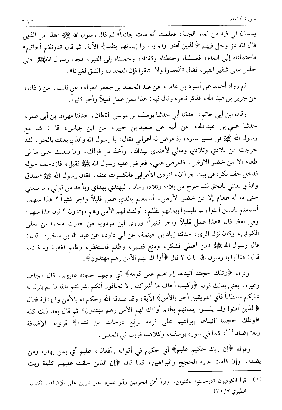 أَسَمِعْتُمْ بِالَّذِينِ آمَنُوا وَلَمْ يَلْبِسُوا إِيمَانَهُمْ بِظُلْمٍ، أُولَئِكَ لَهُمُ الْأَمْنُ وهم مهتدون؟ فإن هذا منهم» وفي لفظ قال «هذا عمل قليلا وأجر كثيرا» وَرَوَى ابْنُ مَرْدَوَيْهِ مِنْ حَدِيثِ مُحَمَّدِ بْنِ يعلى الكوفي، وَكَانَ نَزَلَ الرَّيَّ، حَدَّثَنَا زِيَادُ بْنُ خَيْثَمَةَ، عَنْ أَبِي دَاوُدَ، عَنْ عَبْدِ اللَّهِ بْنِ سخبرة، قَالَ: