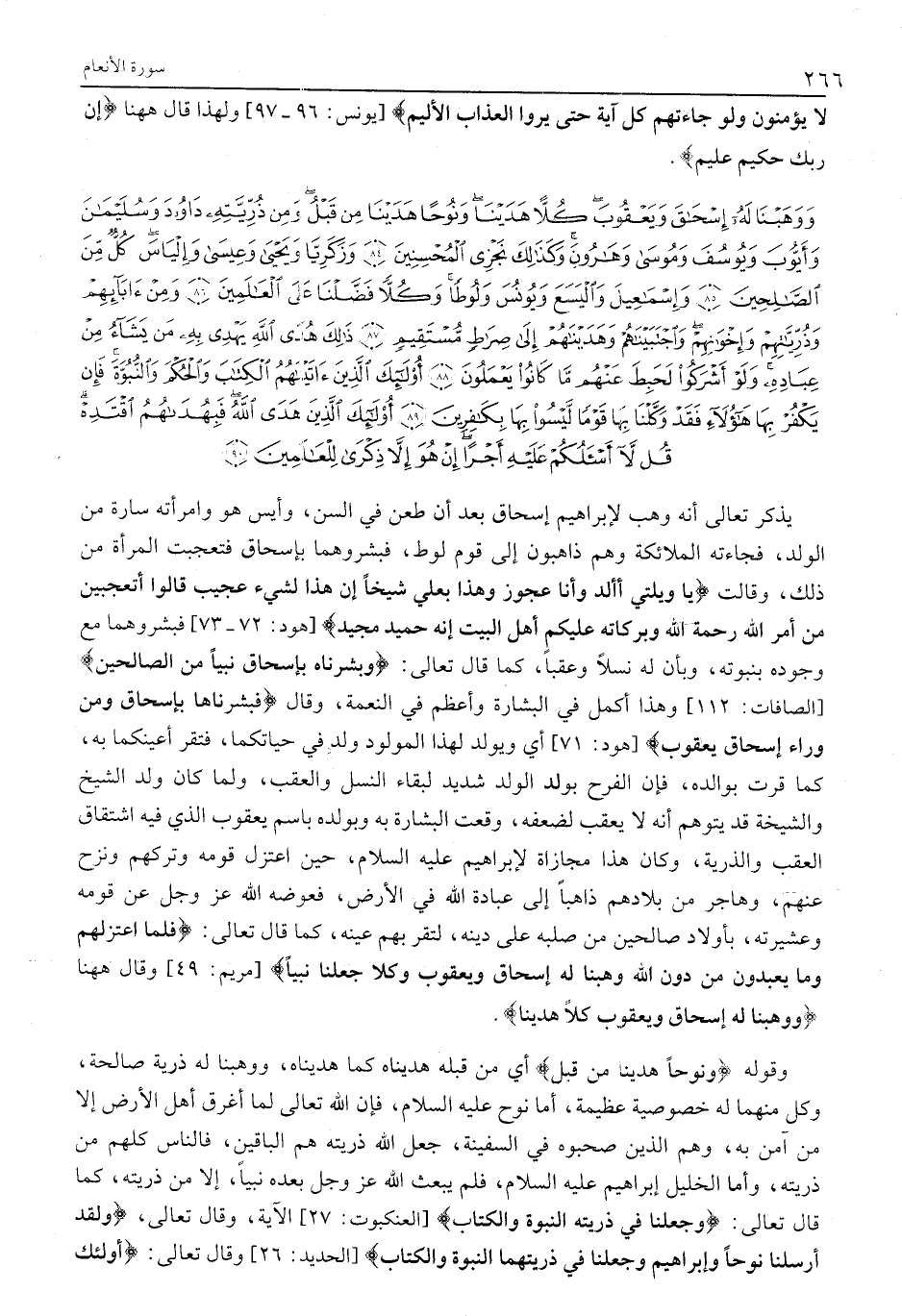 وَوَهَبْنا لَهُ إِسْحاقَ وَيَعْقُوبَ كُلاًّ هَدَيْنا وَنُوحاً هَدَيْنا مِنْ قَبْلُ وَمِنْ ذُرِّيَّتِهِ داوُدَ وَسُلَيْمانَ وَأَيُّوبَ وَيُوسُفَ وَمُوسى وَهارُونَ وَكَذلِكَ نَجْزِي الْمُحْسِنِينَ (84) وَزَكَرِيَّا وَيَحْيى وَعِيسى وَإِلْياسَ كُلٌّ مِنَ الصَّالِحِينَ (85) وَإِسْماعِيلَ وَالْيَسَعَ وَيُونُسَ وَلُوطاً وَكلاًّ فَضَّلْنا عَلَى الْعالَمِينَ (86) وَمِنْ آبائِهِمْ وَذُرِّيَّاتِهِمْ وَإِخْوانِهِمْ وَاجْتَبَيْناهُمْ وَهَدَيْناهُمْ إِلى صِراطٍ مُسْتَقِيمٍ (87) ذلِكَ هُدَى اللَّهِ يَهْدِي بِهِ مَنْ يَشاءُ مِنْ عِبادِهِ وَلَوْ أَشْرَكُوا لَحَبِطَ عَنْهُمْ مَا كانُوا يَعْمَلُونَ (88)