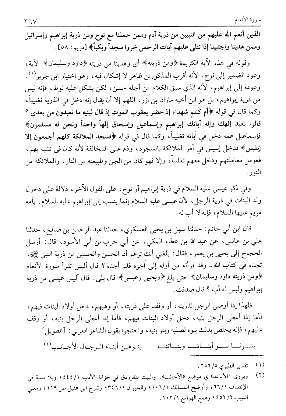 وَفِي ذِكْرِ عِيسَى عَلَيْهِ السَّلَامُ فِي ذُرِّيَّةِ إِبْرَاهِيمَ أَوْ نُوحٍ، عَلَى الْقَوْلِ الْآخَرِ، دَلَالَةٌ عَلَى دُخُولِ وَلَدِ البنات في ذرية الرجل، لِأَنَّ عِيسَى عَلَيْهِ السَّلَامُ إِنَّمَا يُنْسَبُ إِلَى إِبْرَاهِيمَ عَلَيْهِ السَّلَامُ، بِأُمِّهِ مَرْيَمَ عَلَيْهَا السَّلَامُ، فَإِنَّهُ لَا أَبَ لَهُ.