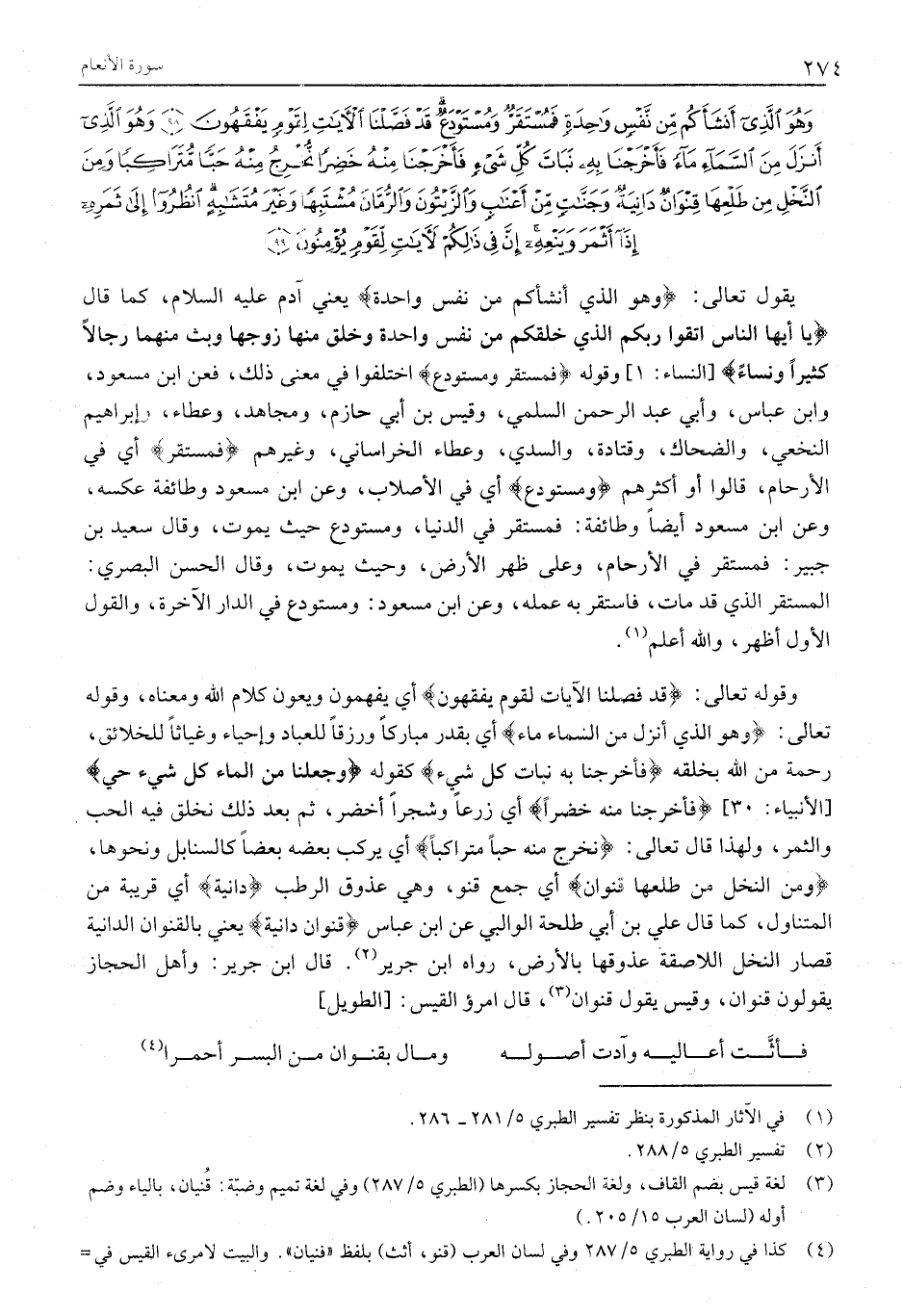 (3) لغة قيس بضم القاف، ولغة الحجاز بكسرها (الطبري 5/ 287) وفي لغة تميم وضبّة: قنيان، بالياء وضم أوله (لسان العرب 15/ 205) .