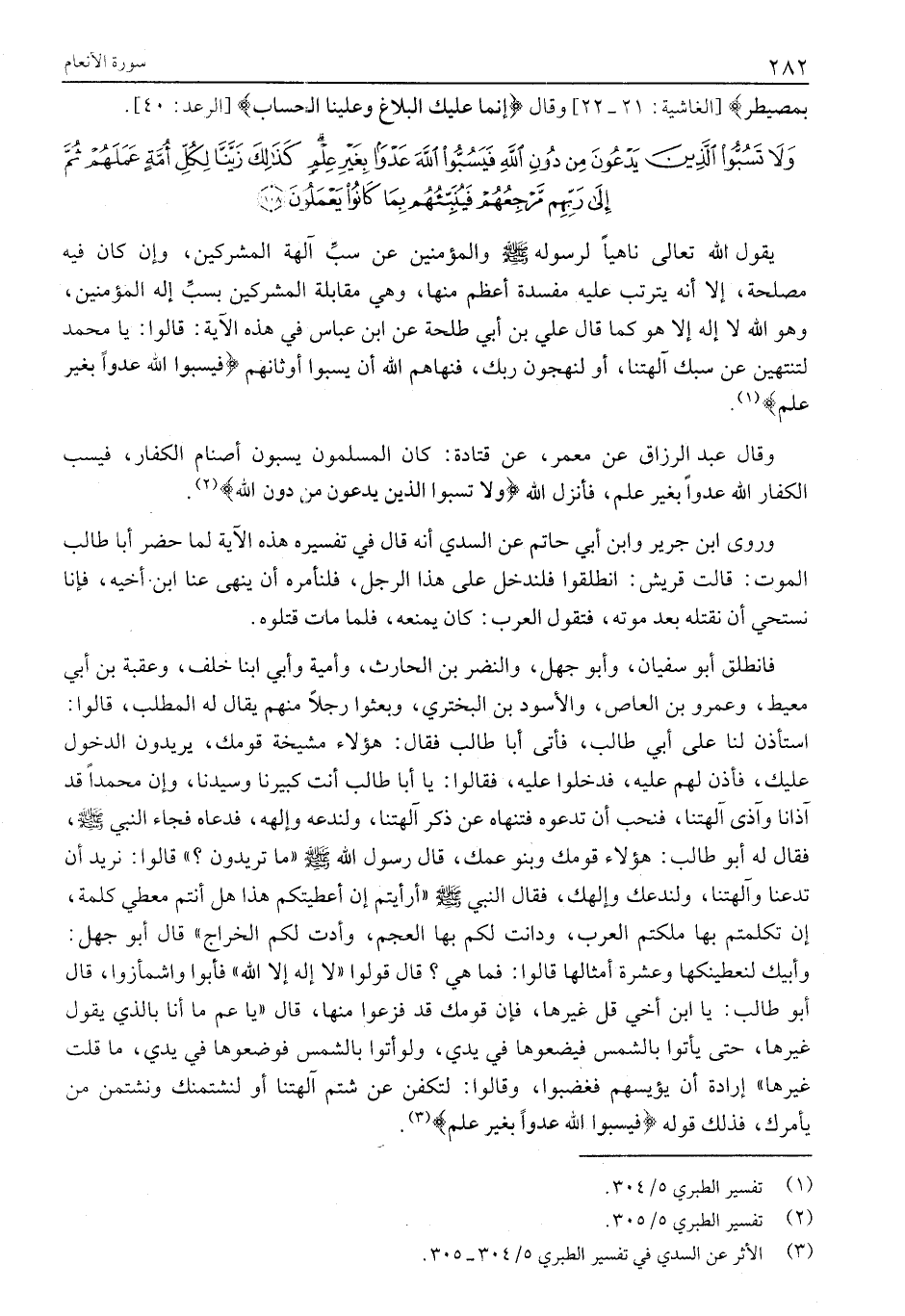 وَأَبِيكَ لَنُعْطِيَنَّكَهَا وَعَشَرَةَ أمثالها قالوا: فَمَا هِيَ؟ قَالَ قُولُوا «لَا إِلَهَ إِلَّا اللَّهُ» فَأَبَوْا وَاشْمَأَزُّوا، قَالَ أَبُو طَالِبٍ: يَا ابْنَ أَخِي قُلْ غَيْرَهَا، فَإِنَّ قَوْمَكَ قَدْ فَزِعُوا مِنْهَا، قَالَ «يَا عَمِّ مَا أَنَا بالذي يقول غَيْرَهَا، حَتَّى يَأْتُوا بِالشَّمْسِ فَيَضَعُوهَا فِي يَدِي، وَلَوْ أَتَوْا بِالشَّمْسِ فَوَضَعُوهَا فِي يَدِي، مَا قُلْتُ غَيْرَهَا» إِرَادَةَ أَنْ يُؤَيِّسَهُمْ فَغَضِبُوا، وَقَالُوا: لتكفن عن شتم آلهتنا أو لنشتمنك ونشتمن مَنْ يَأْمُرُكَ، فَذَلِكَ قَوْلُهُ فَيَسُبُّوا اللَّهَ عَدْواً بِغَيْرِ عِلْمٍ «3» .