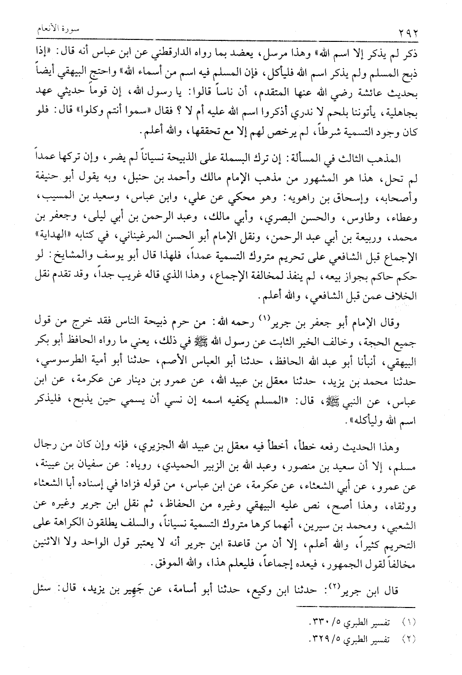 وَقَالَ الْإِمَامُ أَبُو جَعْفَرِ بْنُ جَرِيرٍ «1» رَحِمَهُ اللَّهُ: من حرم ذبيحة الناس فَقَدْ خَرَجَ مِنْ قَوْلِ جَمِيعِ الْحُجَّةِ، وَخَالَفَ الخير الثَّابِتَ عَنْ رَسُولِ اللَّهِ صَلَّى اللَّهُ عَلَيْهِ وَسَلَّمَ فِي ذَلِكَ، يَعْنِي مَا رَوَاهُ الْحَافِظُ أَبُو بَكْرٍ الْبَيْهَقِيُّ، أَنْبَأَنَا أَبُو عَبْدِ اللَّهِ الْحَافِظُ، حَدَّثَنَا أَبُو الْعَبَّاسِ الْأَصَمُّ، حَدَّثَنَا أَبُو أُمَيَّةَ الطَّرْسُوسِيُّ، حَدَّثَنَا مُحَمَّدُ بْنُ يَزِيدَ، حَدَّثَنَا مَعْقِلِ بْنِ عُبَيْدِ اللَّهِ، عَنْ عَمْرِو بْنِ دِينَارٍ عَنْ عِكْرِمَةَ، عَنِ ابْنِ عَبَّاسٍ، عَنِ النَّبِيِّ صَلَّى اللَّهُ عَلَيْهِ وَسَلَّمَ، قَالَ: «الْمُسْلِمُ يَكْفِيهِ اسْمُهُ إِنْ نَسِيَ أَنْ يُسَمِّيَ حِينَ يَذْبَحُ، فَلْيَذْكُرِ اسْمَ اللَّهِ وَلْيَأْكُلْهُ» .