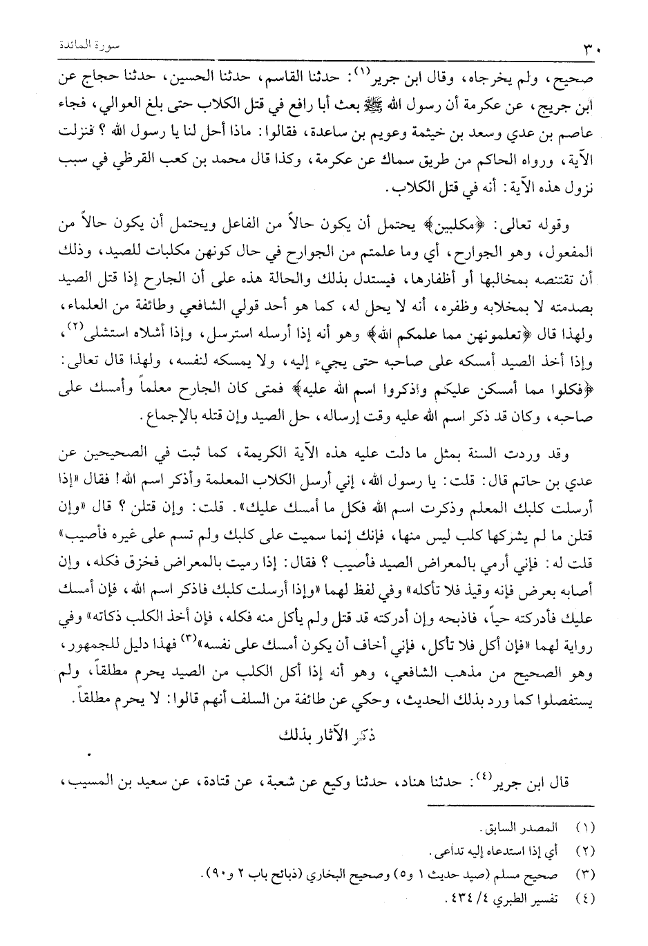 وَقَدْ وَرَدَتِ السُّنَّةُ بِمِثْلِ مَا دَلَّتْ عَلَيْهِ هَذِهِ الْآيَةُ الْكَرِيمَةُ، كَمَا ثَبَتَ فِي الصَّحِيحَيْنِ عَنْ عَدِيِّ بْنِ حَاتِمٍ قَالَ: قُلْتُ: يَا رسول اللَّهِ، إِنِّي أُرْسِلُ الْكِلَابَ الْمُعَلَّمَةَ وَأَذْكُرُ اسْمَ اللَّهِ! فَقَالَ «إِذَا أَرْسَلْتَ كَلْبَكَ الْمُعَلَّمَ وَذَكَرْتَ اسْمَ اللَّهِ فَكُلْ مَا أَمْسَكَ عَلَيْكَ» . قُلْتُ: وَإِنْ قَتَلْنَ؟ قَالَ «وَإِنْ قَتَلْنَ مَا لَمْ يُشْرِكْهَا كَلْبٌ لَيْسَ مِنْهَا، فَإِنَّكَ إِنَّمَا سَمَّيْتَ على كلبك ولم تسم على غيره فأصيب» قُلْتُ لَهُ: فَإِنِّي أَرْمِي بِالْمِعْرَاضِ الصَّيْدَ فَأُصِيبُ؟ فَقَالَ: إِذَا رَمَيْتَ بِالْمِعْرَاضِ فَخَزَقَ فَكُلْهُ، وَإِنْ أَصَابَهُ بِعَرْضٍ فَإِنَّهُ وَقِيذٌ فَلَا تَأْكُلْهُ» وَفِي لفظ لهما «وإذا أَرْسَلْتَ كَلْبَكَ فَاذْكُرِ اسْمَ اللَّهِ، فَإِنْ أَمْسَكَ عَلَيْكَ فَأَدْرَكْتَهُ حَيًّا، فَاذْبَحْهُ وَإِنْ أَدْرَكْتَهُ قَدْ قُتِلَ وَلَمْ يَأْكُلْ مِنْهُ فَكُلْهُ، فَإِنَّ أَخْذَ الْكَلْبِ ذَكَاتُهُ» وَفِي رِوَايَةٍ لَهُمَا «فَإِنْ أَكَلَ فَلَا تَأْكُلْ، فَإِنِّي أَخَافُ أَنْ يَكُونَ أَمْسَكَ عَلَى نَفْسِهِ» «3» فَهَذَا دَلِيلٌ لِلْجُمْهُورِ، وَهُوَ الصَّحِيحُ مِنْ مَذْهَبِ الشَّافِعِيِّ، وَهُوَ أَنَّهُ إِذَا أَكَلَ الْكَلْبُ مِنَ الصَّيْدِ يَحْرُمُ مُطْلَقًا، وَلَمْ يَسْتَفْصِلُوا كَمَا وَرَدَ بِذَلِكَ الْحَدِيثُ، وَحُكِيَ عَنْ طَائِفَةٍ مِنَ السَّلَفِ أَنَّهُمْ قَالُوا: لَا يَحْرُمُ مُطْلَقًا.