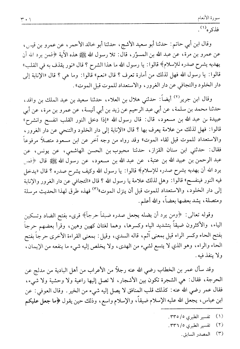 وَقَالَ ابْنُ جَرِيرٍ «2» أَيْضًا: حَدَّثَنِي هِلَالُ بْنُ الْعَلَاءِ، حَدَّثَنَا سَعِيدُ بْنُ عَبْدِ الْمَلِكِ بْنِ وَاقَدٍ، حَدَّثَنَا مُحَمَّدُ بْنُ سَلَمَةَ، عَنْ أَبِي عَبْدِ الرَّحِيمِ عَنْ زَيْدِ بْنِ أَبِي أُنَيْسَةَ، عَنْ عَمْرِو بْنِ مُرَّةَ، عَنْ أَبِي عُبَيْدَةَ بْنِ عَبْدِ اللَّهِ بْنِ مَسْعُودٍ، قَالَ: قَالَ رَسُولُ الله «إِذَا دَخَلَ النُّورُ الْقَلْبَ انْفَسَحَ وَانْشَرَحَ» قَالُوا: فَهَلْ لِذَلِكَ مِنْ عَلَامَةٍ يُعْرَفُ بِهَا؟ قَالَ «الْإِنَابَةُ إِلَى دَارِ الْخُلُودِ وَالتَّنَحِّي عَنْ دَارِ الغرور، والاستعداد للموت قبل لقاء الموت» وقد رواه مِنْ وَجْهٍ آخَرَ عَنِ ابْنِ مَسْعُودٍ مُتَّصِلًا مَرْفُوعًا فَقَالَ: حَدَّثَنِي ابْنُ سِنَانٍ الْقَزَّازُ، حَدَّثَنَا مَحْبُوبُ بْنُ الْحَسَنِ الْهَاشِمِيُّ، عَنْ يُونُسَ، عَنْ عَبْدِ الرَّحْمَنِ بْنِ عُبَيْدِ اللَّهِ بْنِ عُتْبَةَ، عَنْ عَبْدِ اللَّهِ بْنِ مَسْعُودٍ، عَنْ رَسُولِ اللَّهِ صَلَّى اللَّهُ عَلَيْهِ وَسَلَّمَ قَالَ فَمَنْ يُرِدِ اللَّهُ أَنْ يَهْدِيَهُ يَشْرَحْ صَدْرَهُ لِلْإِسْلامِ قَالُوا: يَا رَسُولَ اللَّهِ وَكَيْفَ يُشْرَحُ صَدْرُهُ؟ قال «يدخل فيه النور فَيَنْفَسِحُ» قَالُوا: وَهَلْ لِذَلِكَ عَلَامَةٌ يَا رَسُولَ اللَّهِ؟ قَالَ «التَّجَافِي عَنْ دَارِ الْغُرُورِ وَالْإِنَابَةُ إِلَى دَارِ الْخُلُودِ، وَالِاسْتِعْدَادُ لِلْمَوْتِ قَبْلَ أَنْ يَنْزِلَ الْمَوْتُ» «3» فَهَذِهِ طُرُقٌ لِهَذَا الْحَدِيثِ مُرْسَلَةٌ وَمُتَّصِلَةٌ، يَشُدُّ بَعْضُهَا بَعْضًا، وَاللَّهُ أَعْلَمُ.