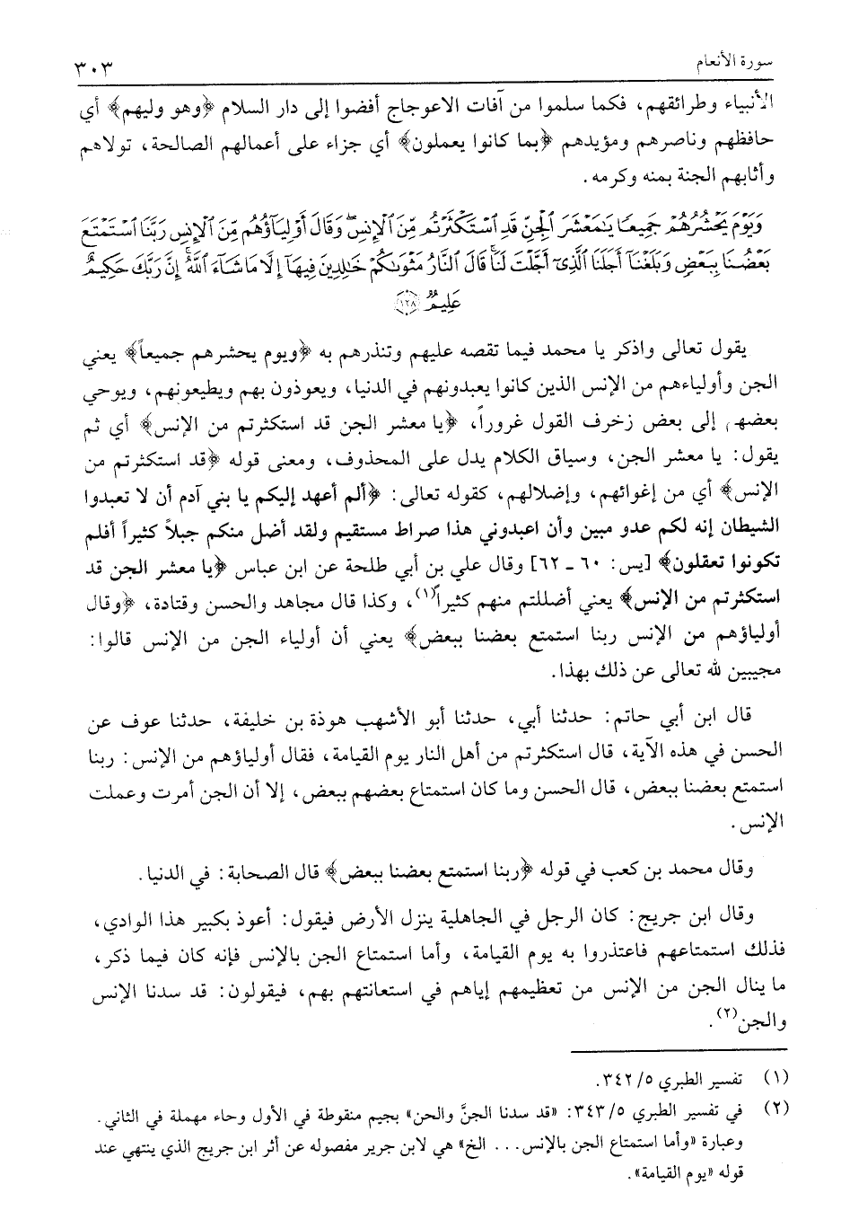 وعبارة «وأما استمتاع الجن بالإنس ... إلخ» هي لابن جرير مفصوله عن أثر ابن جريج الذي ينتهي عند قوله «يوم القيامة» .