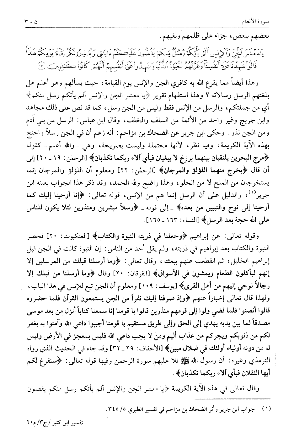 وقوله تَعَالَى: عَنْ إِبْرَاهِيمَ وَجَعَلْنا فِي ذُرِّيَّتِهِ النُّبُوَّةَ وَالْكِتابَ [الْعَنْكَبُوتِ: 20] فَحَصَرَ النُّبُوَّةَ وَالْكِتَابَ بَعْدَ إِبْرَاهِيمَ فِي ذُرِّيَّتِهِ، وَلَمْ يَقُلْ أَحَدٌ مِنَ النَّاسِ: إِنَّ النُّبُوَّةَ كَانَتْ فِي الْجِنِّ قَبْلَ إِبْرَاهِيمَ الخليل، ثُمَّ انْقَطَعَتْ عَنْهُمْ بِبَعْثَتِهِ، وَقَالَ تَعَالَى: وَما أَرْسَلْنا قَبْلَكَ مِنَ الْمُرْسَلِينَ إِلَّا إِنَّهُمْ لَيَأْكُلُونَ الطَّعامَ وَيَمْشُونَ فِي الْأَسْواقِ [الْفُرْقَانِ: 20] وَقَالَ وَما أَرْسَلْنا مِنْ قَبْلِكَ إِلَّا رِجالًا نُوحِي إِلَيْهِمْ مِنْ أَهْلِ الْقُرى [يُوسُفَ: 109] وَمَعْلُومٌ أَنَّ الْجِنَّ تَبَعٌ لِلْإِنْسِ فِي هَذَا الْبَابِ، وَلِهَذَا قَالَ تَعَالَى إِخْبَارًا عَنْهُمْ وَإِذْ صَرَفْنا إِلَيْكَ نَفَراً مِنَ الْجِنِّ يَسْتَمِعُونَ الْقُرْآنَ فَلَمَّا حَضَرُوهُ قالُوا أَنْصِتُوا فَلَمَّا قُضِيَ وَلَّوْا إِلى قَوْمِهِمْ مُنْذِرِينَ قالُوا يَا قَوْمَنا إِنَّا سَمِعْنا كِتاباً أُنْزِلَ مِنْ بَعْدِ مُوسى مُصَدِّقاً لِما بَيْنَ يَدَيْهِ يَهْدِي إِلَى الْحَقِّ وَإِلى طَرِيقٍ مُسْتَقِيمٍ يَا قَوْمَنا أَجِيبُوا داعِيَ اللَّهِ وَآمِنُوا بِهِ يَغْفِرْ لَكُمْ مِنْ ذُنُوبِكُمْ وَيُجِرْكُمْ مِنْ عَذابٍ أَلِيمٍ وَمَنْ لَا يُجِبْ داعِيَ اللَّهِ فَلَيْسَ بِمُعْجِزٍ فِي الْأَرْضِ وَلَيْسَ لَهُ مِنْ دُونِهِ أَوْلِياءُ أُولئِكَ فِي ضَلالٍ مُبِينٍ [الْأَحْقَافِ: 29- 32] وَقَدْ جَاءَ فِي الْحَدِيثِ الَّذِي رَوَاهُ التِّرْمِذِيُّ وَغَيْرِهِ: أَنَّ رَسُولَ اللَّهِ صَلَّى اللَّهُ عَلَيْهِ وسلم تَلَا عَلَيْهِمْ سُورَةَ الرَّحْمَنِ وَفِيهَا قَوْلُهُ تَعَالَى: سَنَفْرُغُ لَكُمْ أَيُّهَ الثَّقَلانِ فَبِأَيِّ آلاءِ رَبِّكُما تُكَذِّبانِ.