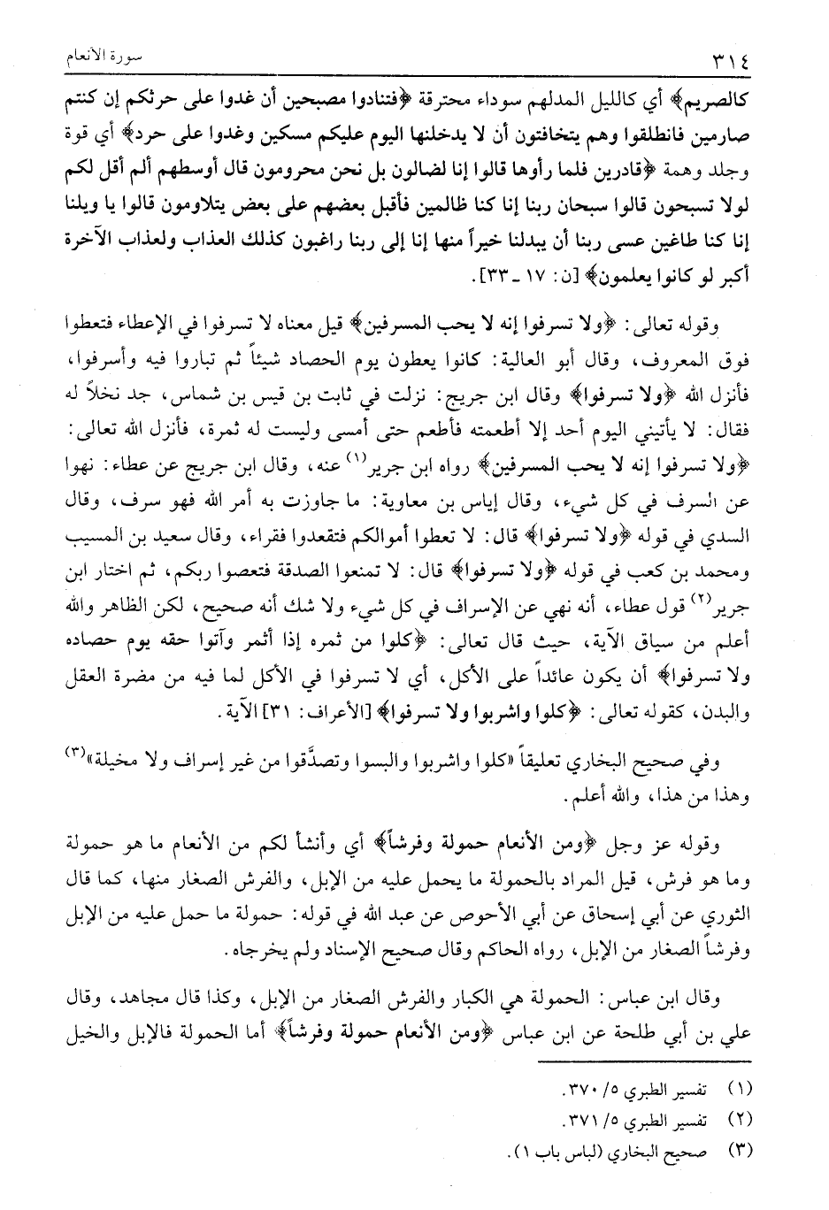وَلا تُسْرِفُوا إِنَّهُ لَا يُحِبُّ الْمُسْرِفِينَ رَوَاهُ ابْنُ جَرِيرٍ «1» عَنْهُ، وَقَالَ ابْنُ جُرَيْجٍ عَنْ عطاء: نهوا عَنِ السَّرَفِ فِي كُلِّ شَيْءٍ، وَقَالَ إِيَاسُ بْنُ مُعَاوِيَةَ: مَا جَاوَزْتَ بِهِ أَمْرَ اللَّهِ فَهُوَ سَرَفٌ، وَقَالَ السُّدِّيُّ فِي قَوْلِهِ وَلا تُسْرِفُوا قَالَ: لَا تُعْطُوا أَمْوَالَكُمْ فَتَقْعُدُوا فُقَرَاءَ، وَقَالَ سَعِيدُ بْنُ الْمُسَيِّبِ وَمُحَمَّدُ بْنُ كَعْبٍ فِي قَوْلِهِ وَلا تُسْرِفُوا قَالَ: لَا تَمْنَعُوا الصدقة فتعصوا ربكم، ثُمَّ اخْتَارَ ابْنُ جَرِيرٍ «2» قَوْلَ عَطَاءٍ، إِنَّهُ نَهْيٌ عَنِ الْإِسْرَافِ فِي كُلِّ شَيْءٍ وَلَا شَكَّ أَنَّهُ صَحِيحٌ، لَكِنَّ الظَّاهِرَ وَاللَّهُ أَعْلَمُ مِنْ سِيَاقِ الْآيَةِ، حَيْثُ قَالَ تَعَالَى: كُلُوا مِنْ ثَمَرِهِ إِذا أَثْمَرَ وَآتُوا حَقَّهُ يَوْمَ حَصادِهِ وَلا تُسْرِفُوا أن يكون عائدا على الأكل، أي لا تُسْرِفُوا فِي الْأَكْلِ لِمَا فِيهِ مِنْ مَضَرَّةِ العقل والبدن، كقوله تعالى: كُلُوا وَاشْرَبُوا وَلا تُسْرِفُوا [الأعراف: 31] الآية.