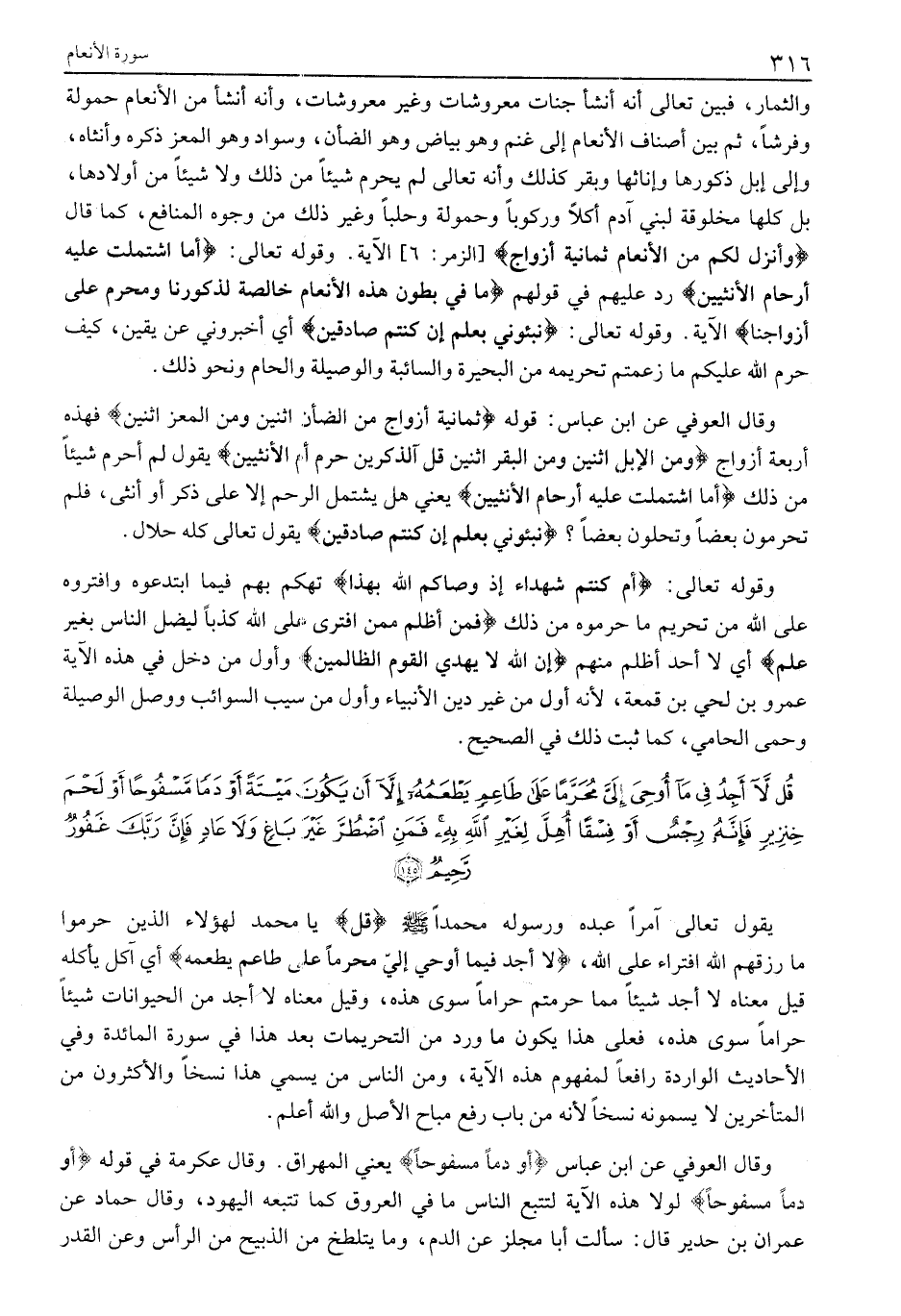 قُلْ لَا أَجِدُ فِي مَا أُوحِيَ إِلَيَّ مُحَرَّماً عَلى طاعِمٍ يَطْعَمُهُ إِلاَّ أَنْ يَكُونَ مَيْتَةً أَوْ دَماً مَسْفُوحاً أَوْ لَحْمَ خِنزِيرٍ فَإِنَّهُ رِجْسٌ أَوْ فِسْقاً أُهِلَّ لِغَيْرِ اللَّهِ بِهِ فَمَنِ اضْطُرَّ غَيْرَ باغٍ وَلا عادٍ فَإِنَّ رَبَّكَ غَفُورٌ رَحِيمٌ (145)