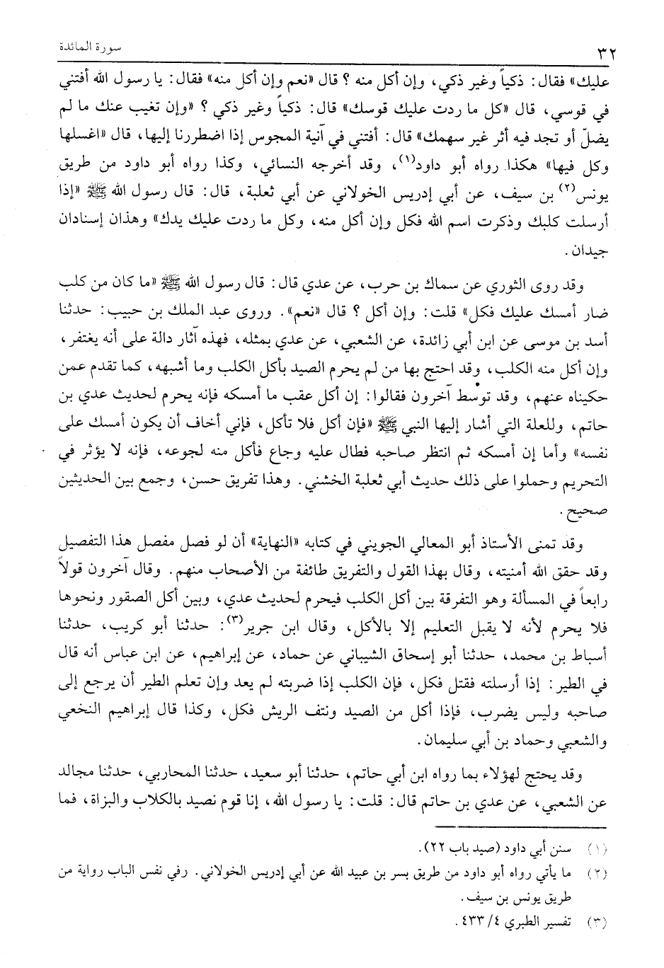 وَقَدْ تَمَنَّى الْأُسْتَاذُ أَبُو الْمَعَالِي الْجُوَيْنِيُّ فِي كِتَابِهِ «النِّهَايَةِ» أَنْ لَوْ فَصَّلَ مُفَصِّلٌ هَذَا التَّفْصِيلَ وَقَدْ حَقَّقَ اللَّهُ أُمْنِيَّتَهُ، وَقَالَ بِهَذَا الْقَوْلِ وَالتَّفْرِيقِ طَائِفَةٌ مِنَ الْأَصْحَابِ مِنْهُمْ. وَقَالَ آخَرُونَ قَوْلًا رَابِعًا فِي الْمَسْأَلَةِ وَهُوَ التَّفْرِقَةُ بَيْنَ أَكْلِ الْكَلْبِ فَيَحْرُمُ لِحَدِيثِ عَدِيٍّ، وَبَيْنَ أَكْلِ الصُّقُورِ وَنَحْوِهَا فَلَا يَحْرُمُ لِأَنَّهُ لَا يَقْبَلُ التَّعْلِيمَ إِلَّا بِالْأَكْلِ، وَقَالَ ابْنُ جَرِيرٍ «3» : حَدَّثَنَا أَبُو كُرَيْبٍ، حَدَّثَنَا أَسْبَاطُ بْنُ مُحَمَّدٍ، حَدَّثَنَا أَبُو إِسْحَاقَ الشَّيْبَانِيُّ عَنْ حَمَّادٍ، عَنْ إِبْرَاهِيمَ، عَنِ ابْنِ عَبَّاسٍ أَنَّهُ قَالَ فِي الطَّيْرِ: إِذَا أَرْسَلْتَهُ فَقَتَلَ فَكُلْ، فَإِنَّ الْكَلْبَ إِذَا ضَرَّبْتَهُ لَمْ يَعْدُ وَإِنْ تَعَلَّمَ الطَّيْرُ أَنْ يَرْجِعَ إِلَى صَاحِبِهِ وَلَيْسَ يَضْرِبُ، فَإِذَا أَكَلَ مِنَ الصَّيْدِ وَنَتَفَ الرِّيشَ فَكُلْ، وَكَذَا قَالَ إِبْرَاهِيمُ النَّخَعِيُّ وَالشَّعْبِيُّ وَحَمَّادُ بْنُ أَبِي سُلَيْمَانَ.