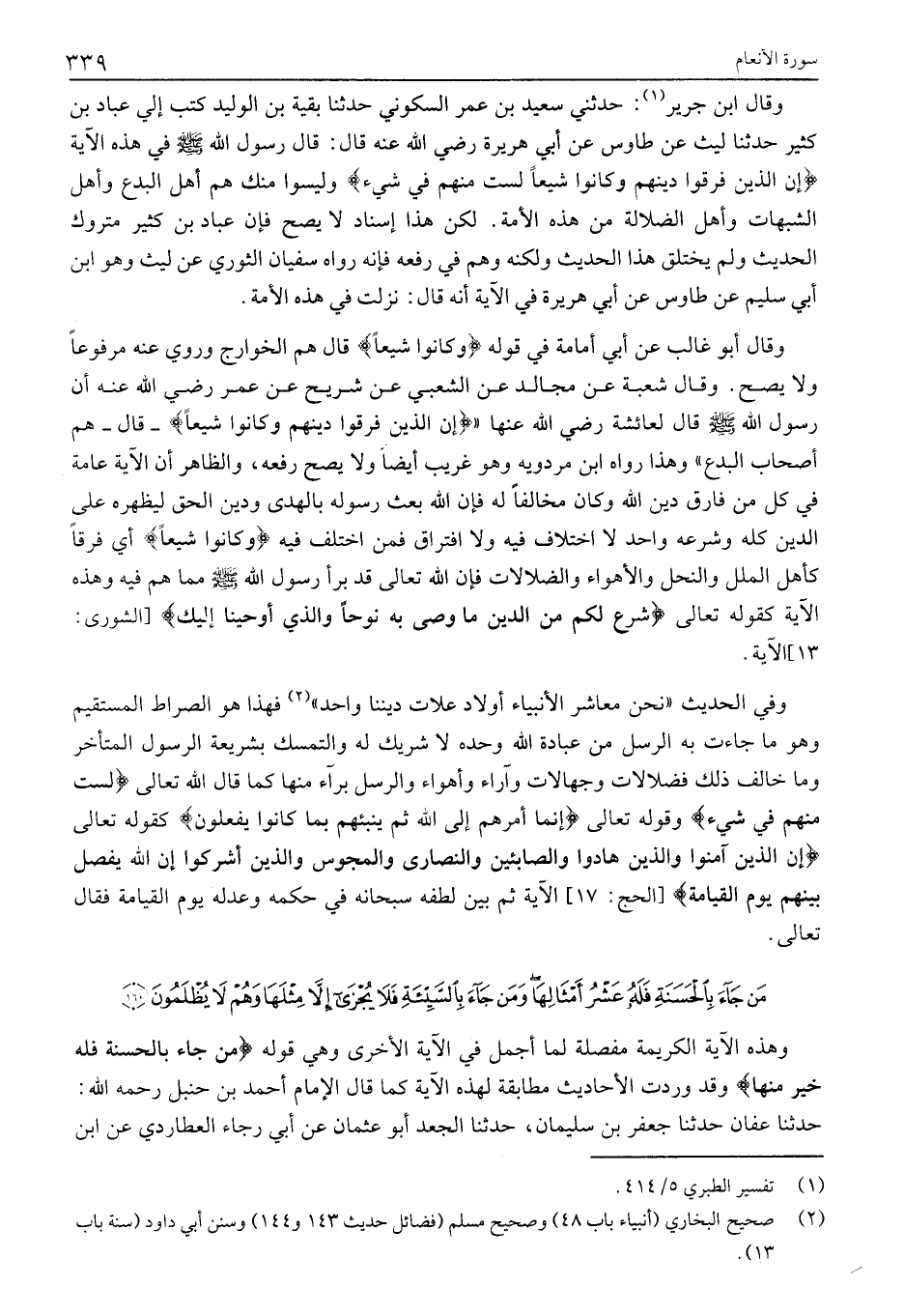 وَقَالَ ابْنُ جَرِيرٍ «1» : حَدَّثَنِي سَعِيدُ بْنُ عُمَرَ السَّكُونِيُّ حَدَّثَنَا بَقِيَّةُ بْنُ الْوَلِيدِ كَتَبَ إِلَيَّ عباد بن كثير حدثنا ليث عن طاوس عَنْ أَبِي هُرَيْرَةَ رَضِيَ اللَّهُ عَنْهُ قَالَ: قَالَ رَسُولُ اللَّهِ صَلَّى اللَّهُ عَلَيْهِ وَسَلَّمَ في هذه الآية إِنَّ الَّذِينَ فَرَّقُوا دِينَهُمْ وَكانُوا شِيَعاً لَسْتَ مِنْهُمْ فِي شَيْءٍ وَلَيْسُوا مِنْكَ هُمْ أَهْلُ الْبِدَعِ وَأَهْلُ الشُّبَهَاتِ وَأَهْلُ الضَّلَالَةِ مِنْ هَذِهِ الأمة. لكن هذا إسناد لَا يَصِحُّ فَإِنَّ عَبَّادَ بْنَ كَثِيرٍ مَتْرُوكُ الْحَدِيثِ وَلَمْ يَخْتَلِقْ هَذَا الْحَدِيثَ وَلَكِنَّهُ وَهِمَ فِي رَفْعِهِ فَإِنَّهُ رَوَاهُ سُفْيَانُ الثَّوْرِيُّ عَنْ لَيْثٍ وَهُوَ ابْنُ أَبِي سُلَيْمٍ عَنْ طَاوُسٍ عن أبي هريرة في الآية أنه قَالَ: نَزَلَتْ فِي هَذِهِ الْأُمَّةِ.