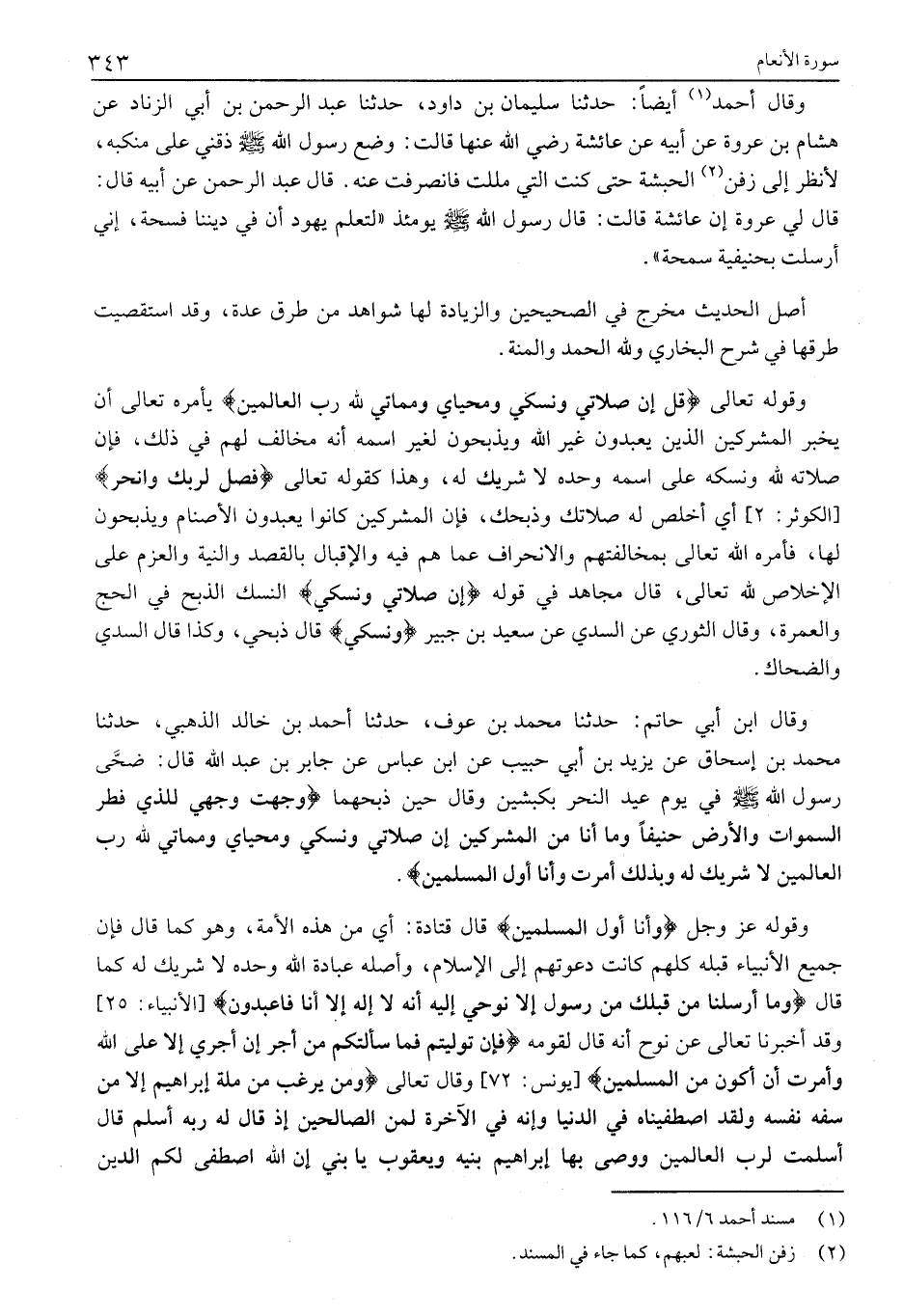وَقَالَ ابْنُ أَبِي حَاتِمٍ: حَدَّثَنَا مُحَمَّدُ بْنُ عَوْفٍ، حدثنا أحمد بن خالد الذهبي، حدثنا مُحَمَّدُ بْنُ إِسْحَاقَ عَنْ يَزِيدَ بْنِ أَبِي حَبِيبٍ عَنِ ابْنِ عَبَّاسٍ عَنْ جَابِرِ بْنِ عَبْدِ اللَّهِ قَالَ: ضَحَّى رَسُولُ اللَّهِ صَلَّى اللَّهُ عَلَيْهِ وَسَلَّمَ فِي يَوْمِ عيد النحر بِكَبْشَيْنِ وَقَالَ حِينَ ذَبَحَهُمَا وَجَّهْتُ وَجْهِيَ لِلَّذِي فَطَرَ السَّماواتِ وَالْأَرْضَ حَنِيفاً وَما أَنَا مِنَ الْمُشْرِكِينَ ... إِنَّ صَلاتِي وَنُسُكِي وَمَحْيايَ وَمَماتِي لِلَّهِ رَبِّ الْعالَمِينَ لَا شَرِيكَ لَهُ وَبِذلِكَ أُمِرْتُ وَأَنَا أَوَّلُ الْمُسْلِمِينَ.